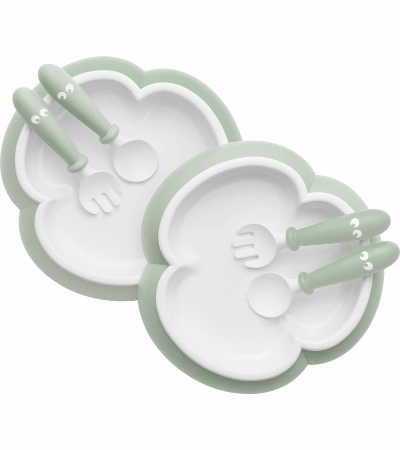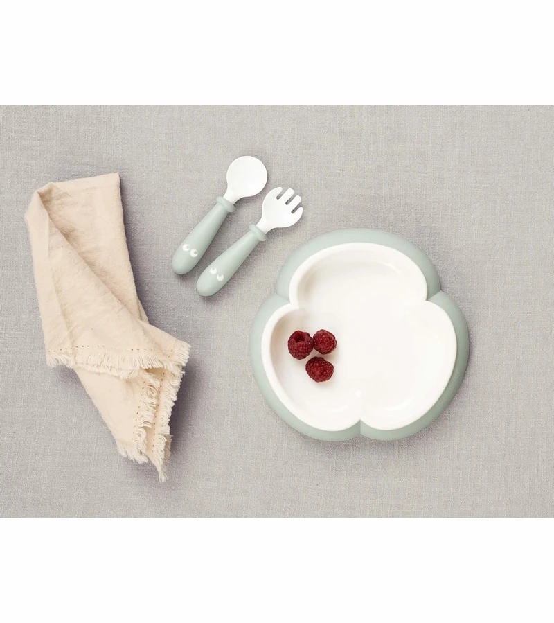 The baby plate, spoon and fork in the set are cleverly designed for little hands and make self-feeding easier for your child. The plateÂ’s trefoil design makes it easier for your child to scoop food onto the spoon or fork. The plate stands sturdily on the table without tipping, and the spoon and fork have short, thick handles that are easy for children to hold. The set is available in several delightful colors that blend in with the modern home and is suitable from the age of approx. 4 months.