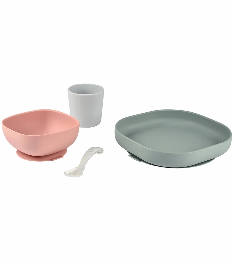 Beaba silicone dish and cutlery set for baby with suction bowl to help toddlers learn how to eat on their own.