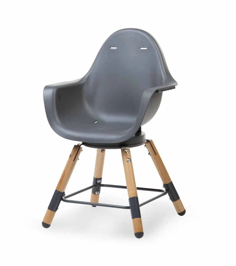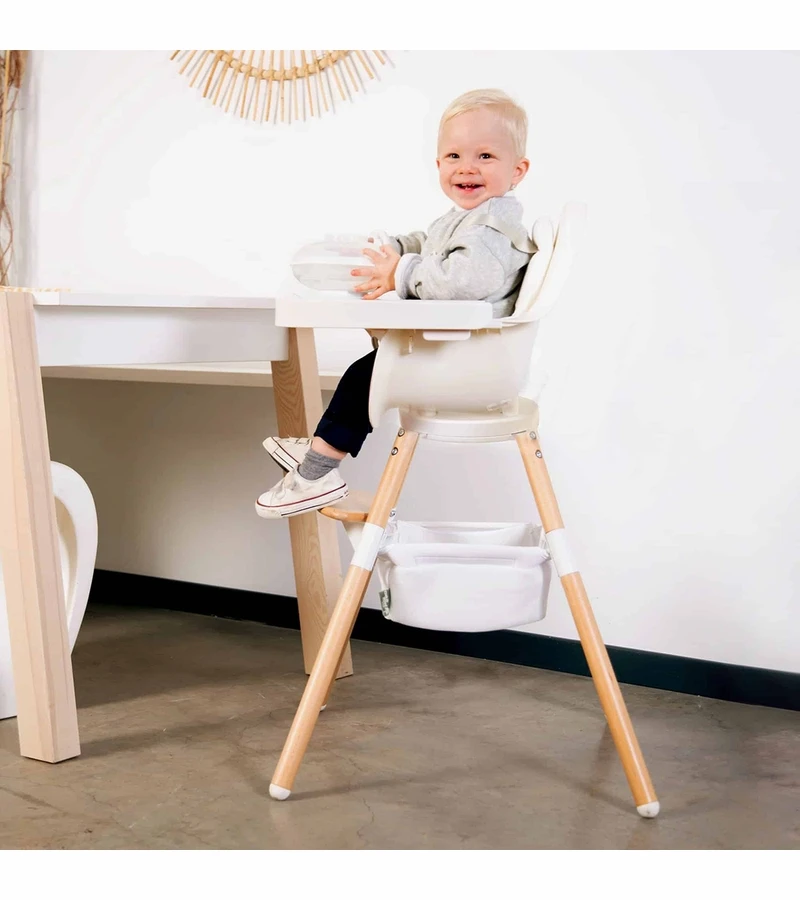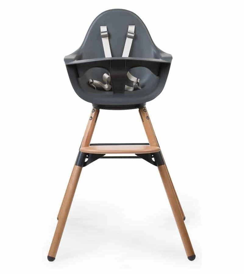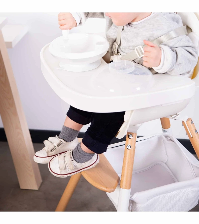 The award-winning Childhome Evolu One.80° High Chair was created to evolve with your growing child, and can be used from 6 months to 6 years. Once your baby outgrows the high chair phase and starts learning to eat on their own, it can be converted to a toddler chair that pulls up to a children’s table. The highchair features a unique 180° swivel seat, which allows parents to rotate baby to meet them comfortably during feedings. Designed to grow with your child, the highchair adjusts to 2 heights, a standard dining table (30 in) and a kid’s table (20 in). Available as an add on, a set of extra long legs give you the option to adjust the highchair to the height of a kitchen island (35 in), giving parents the extra flexibility to feed baby at any surface in their home. Unlike some highchairs, this tray slides to remove instead of tilting to keep food from sliding onto the floor. A safety bar and 5- point harness ensure your little one is secure. Both are removable as your baby grows older and the chair turns to a toddler chair.