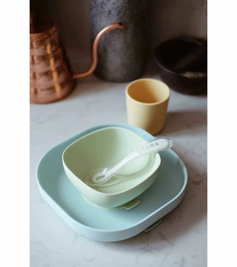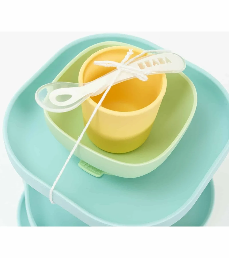The Beaba Meal Set is made from superior quality silicone and is BPA, Lead, and Phthalate-free. It includes a non-slip suction bottom plate, non-slip suction bottom bowl, non-slip cup, and 2nd Stage Silicone Spoon. All items are dishwasher and microwave safe.