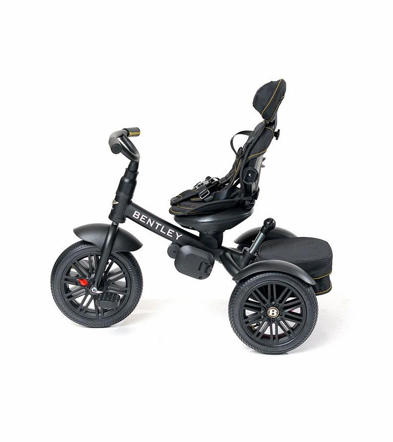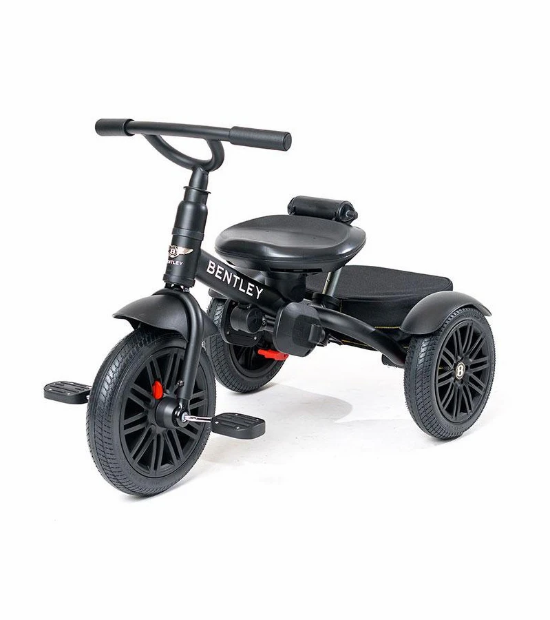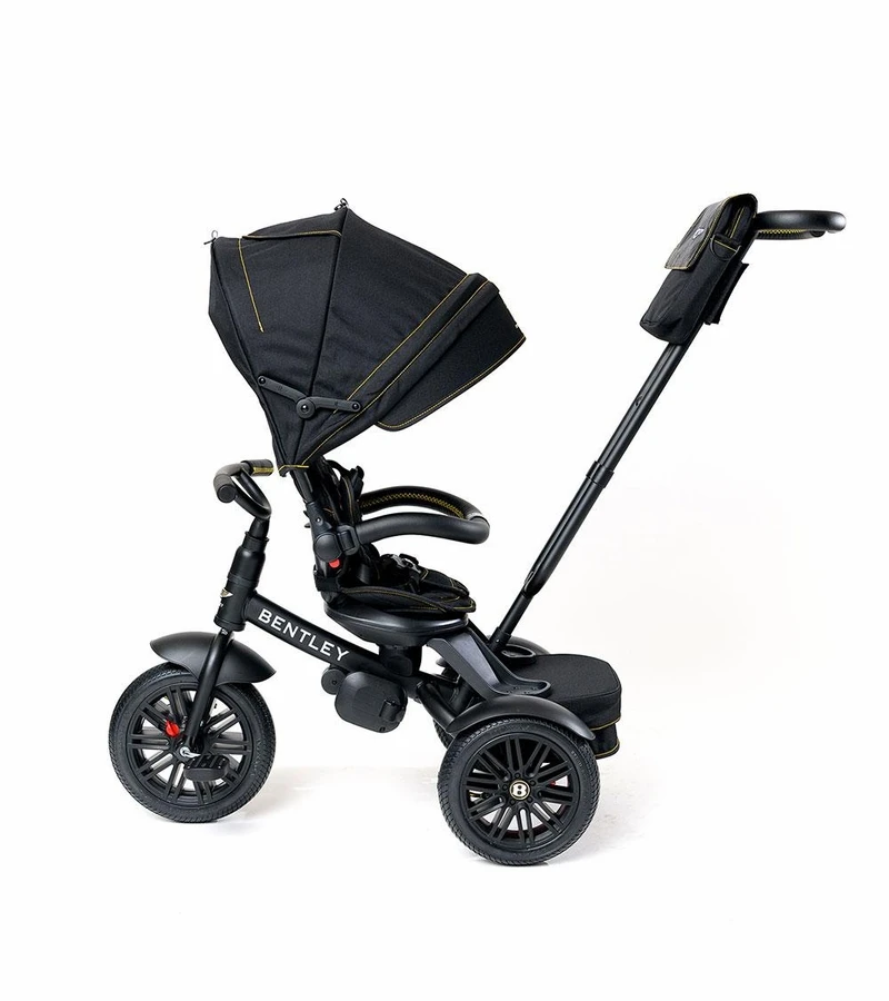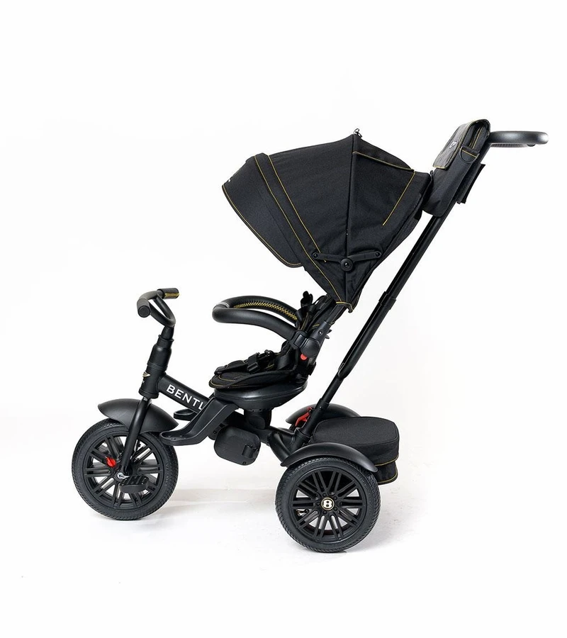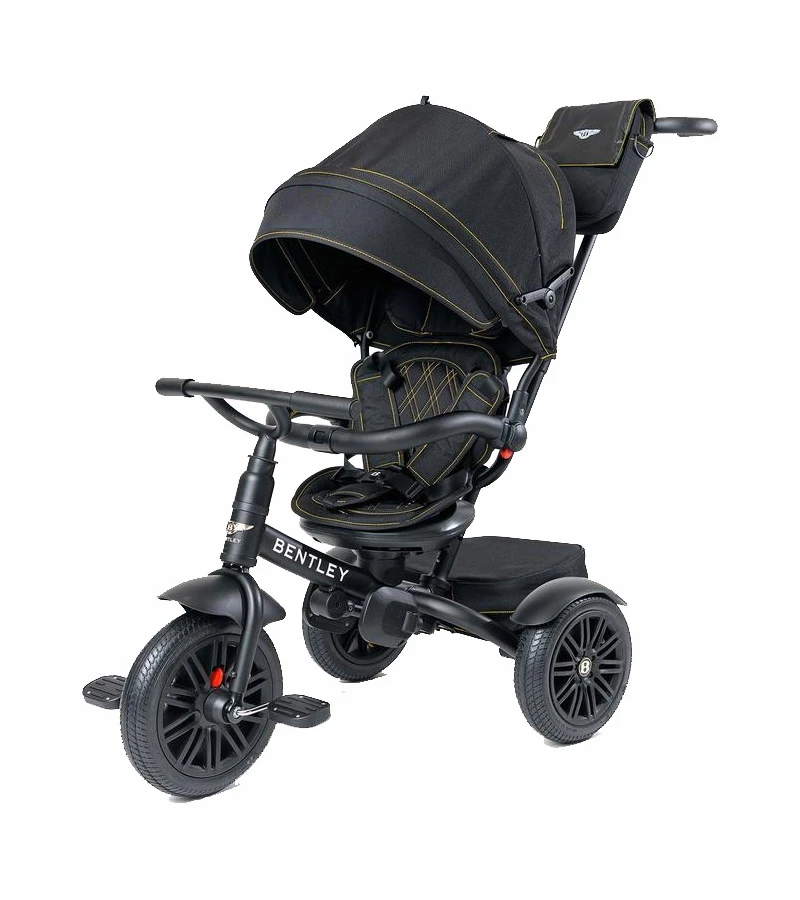 Designed in collaboration with Bentley Motors and your toddlerÕs needs in mind, the Bentley 6-in-1 Stroller/Tricycle is the perfect combination of elegance and function. The Bentley Trike now proudly wears the world-famous badge and embodies the commitment to quality and craftsmanship that the Bentley Motor Company has carefully upheld over the years. Some of the Bentley style features apparent in the stroller trike are: Bentley Continental GT replica wheels – that are made from rubber and filled with air to ensure a smooth ride unlike many competitors, Chrome Bentley logo on the metal frame, and the same color finish as the Bentley Continental cars. Transforming from a stroller to a trike, this product ensures that your infant or toddler is safe and comfortable using it. As they grow, your children can make use of several footrest positions to completely enjoy their time with the Bentley Stroller / Trike. STAGE 1: 6 MONTHS & UP The back support can be adjusted to 2 reclining positions. Parents have total control with the adjustable and removable parent push handle. The seat can also be rotated 180 degrees, so your child can face you. This function and the additional footrests are perfect for infants to start using the stroller. Extra-large canopy has 2 positions and is made of a 50 UPF waterproof fabric to keep wind, rain, and harmful sun rays away. STAGE 2: 18 MONTHS & UP The additional footrests are removed. Parents can also fold and unfold the basic footrests and remove the canopy where appropriate. Freewheel function can be engaged to allow kids to place their feet on the pedals without controlling the wheels. Free handle-bar function can also be enabled to allow kids to move the handle bar without steering the trike. These functions and more create an exciting, comfortable, and safe ride for both the child and the parent.