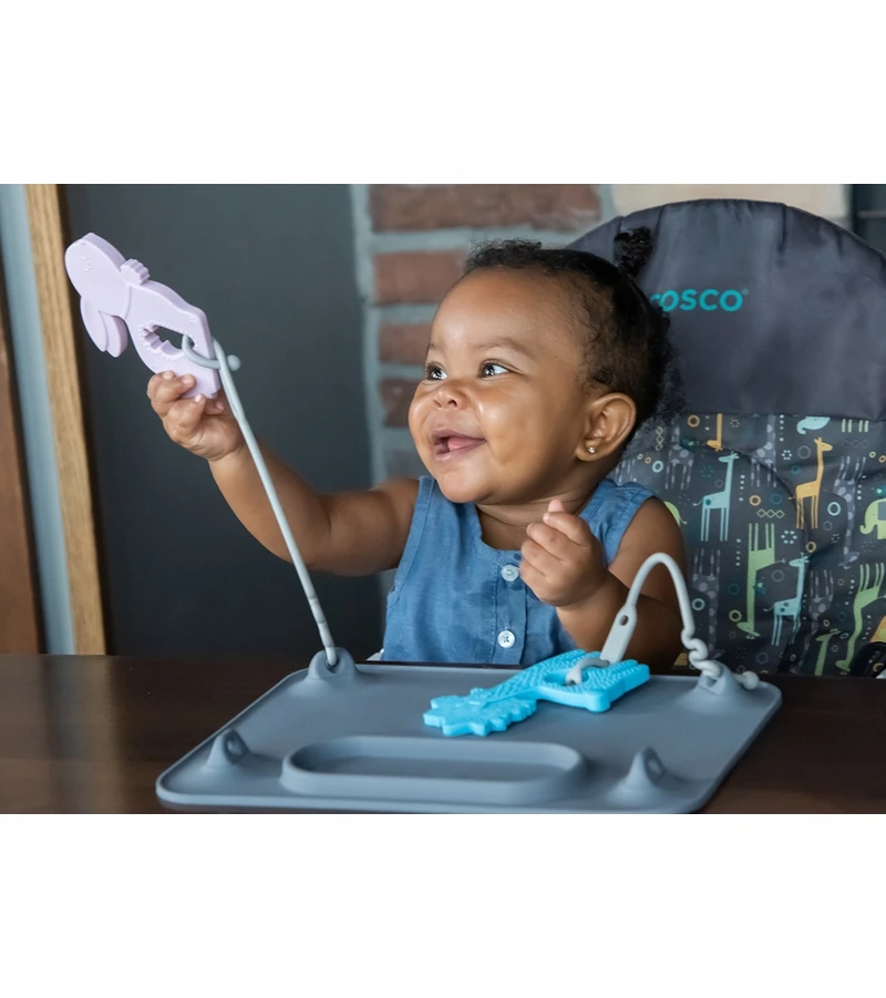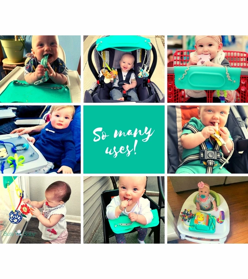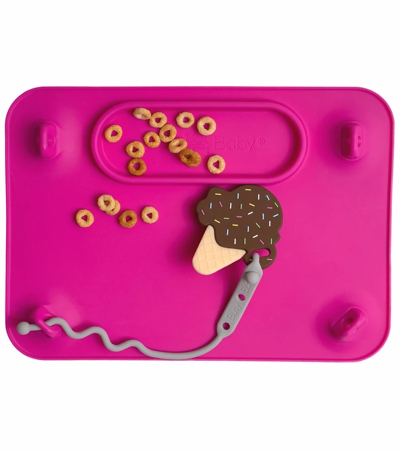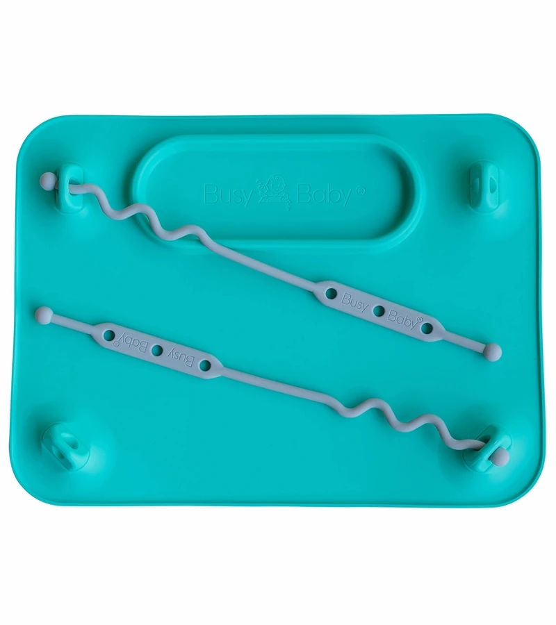The Busy Baby Silicone Placemat is perfect for keeping kids entertained. This non slip children’s placemat includes two easy-attach silicone toy straps to reduce the need to chase dropped and thrown toys.Â