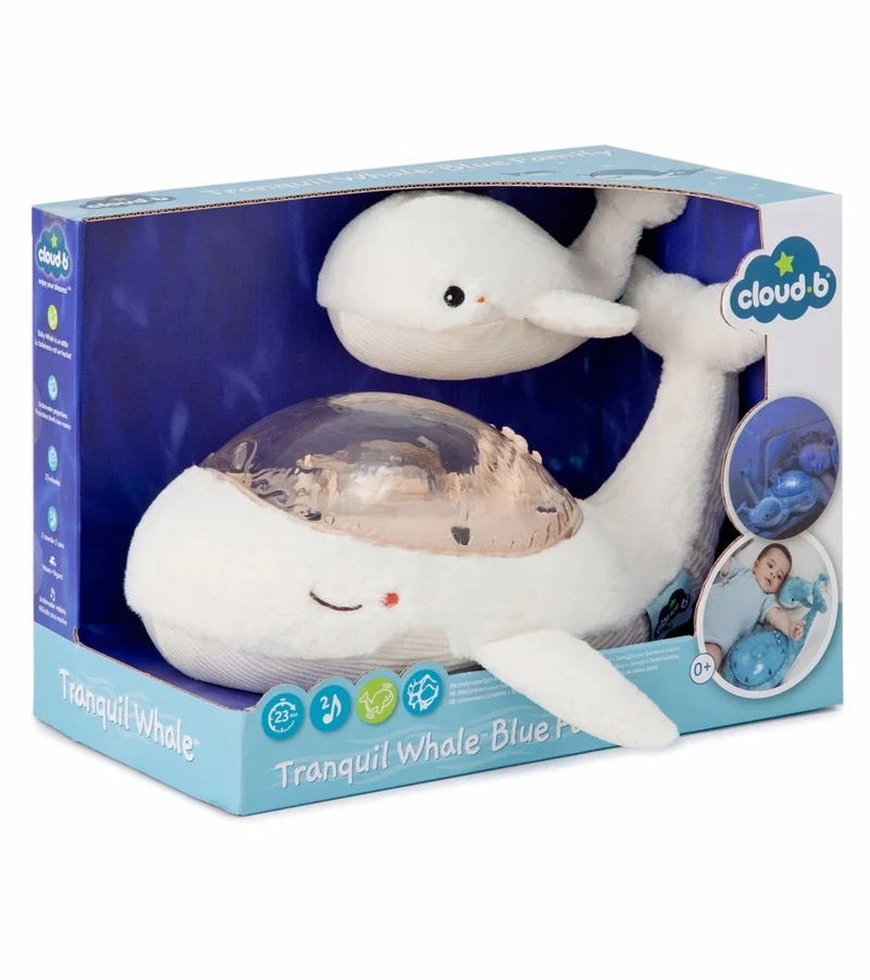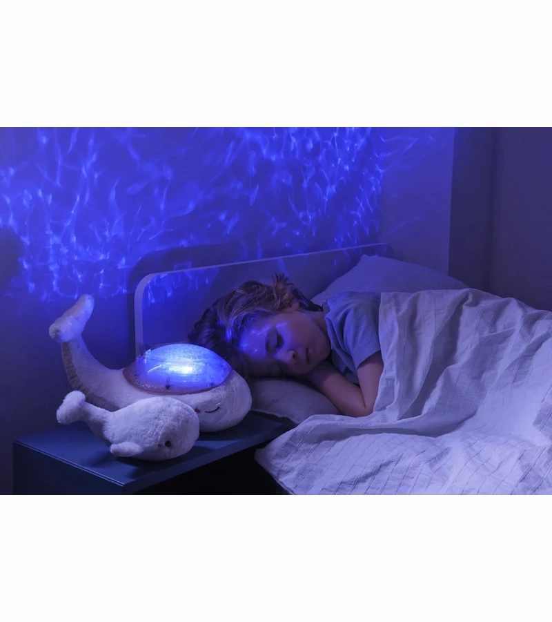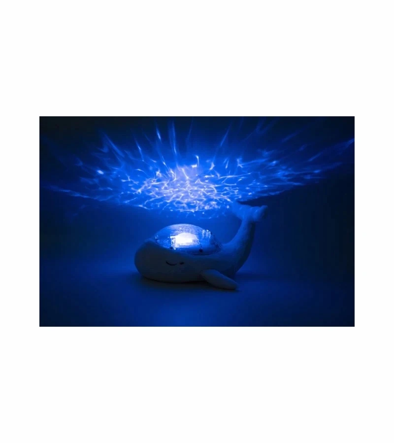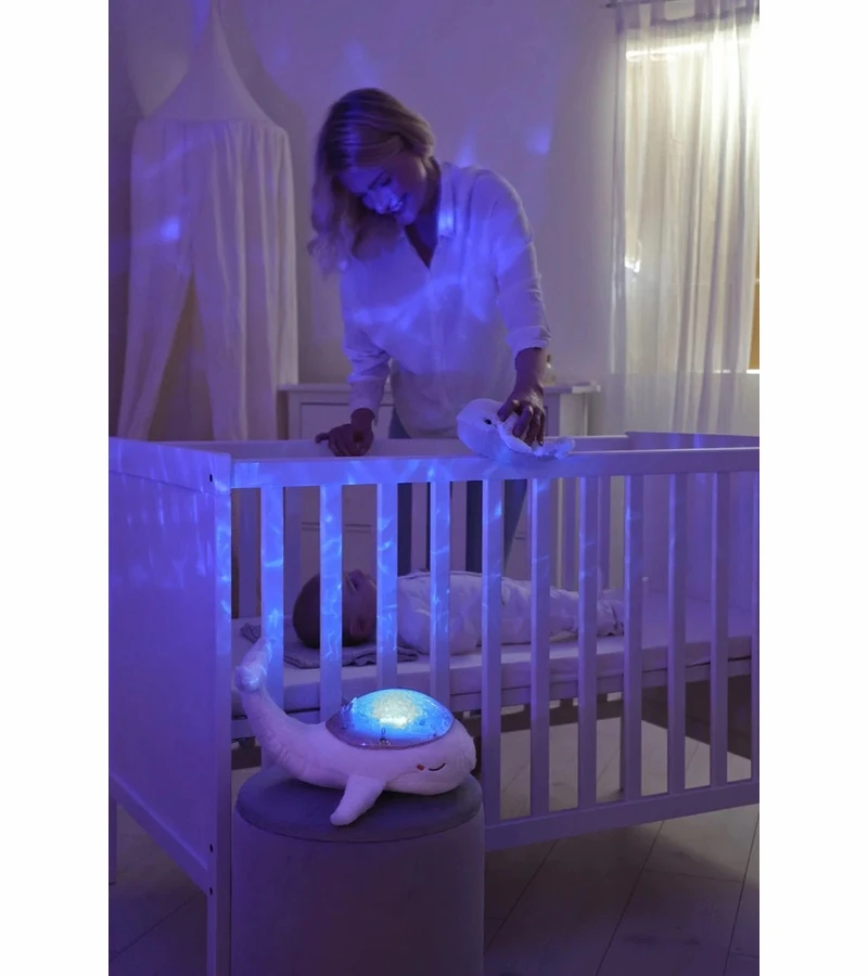 This pretty whale diffuses a soft light and projects on the ceiling of the room the waves of the ocean in movement thanks to a unique and patented mechanism. A marine melody and the sound of the waves (white noise) will soothe the little ones to take them on the way to sleep. Soft plush during the day, it transforms into a nightlight at night. A marine melody and the sound of the waves (white noise) will soothe baby for a relaxing sleep. Its underwater light effect is magical thanks to the projection of moving waves. It is possible to adjust the brightness to create different environments. It has 2 soothing sounds: underwater melody and ocean waves (white noise), and 6 adjustable volume levels. The 23-minute timer ensures complete darkness and silence while the child sleeps soundly. The baby whale plush toy makes a cute ringing sound when the child shakes it and they can take it with them, anywhere!
