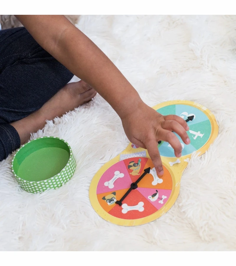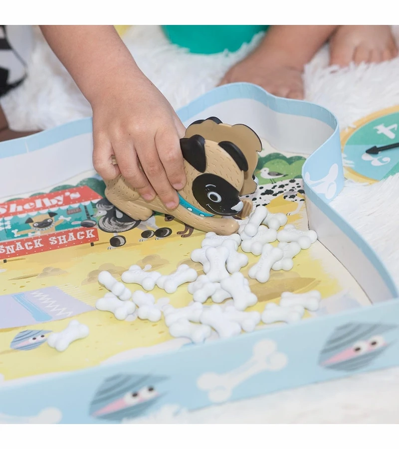 It’s a number and counting bone-anza! This preschool counting bone-anza is a summer day trip to a dog beach! Shelby buried bones in the sand and needs your help collecting them. Help her dig up the most bones and you win! Kids take turns using the adorable Shelby Squeezer to fill their dog bowl with bones. Sounds simple, but be careful-spin a sneaky seagull, and you’ll lose some bones or get sidetracked chewing a flip flop and miss your turn!Â