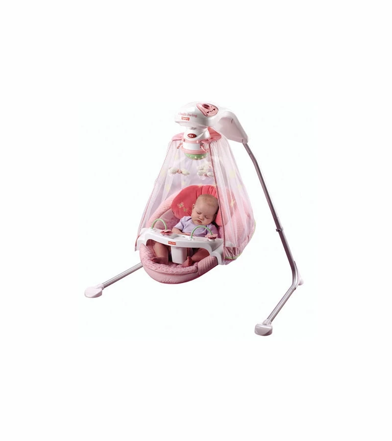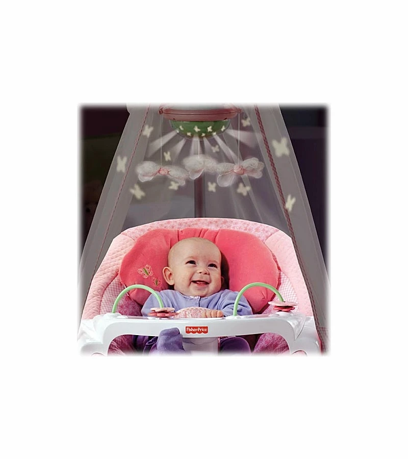 Butterflies go floating byÂ…as they spin overhead for baby. The comfy-cozy seat and head support cradle her in cushy comfort as she swings in a side-to-side or front-to-back swinging motion. A sweet little canopy surrounds baby and sways along with the swing motion while 8 delightful songs entertain. When itÂ’s nap time, mom can play 8 additional lullabies as well as bullfrog and cricket sounds to soothe and calm baby. And with the flick of a switch, thereÂ’s a magical butterfly light show that projects onto the canopy… perfect for floating off to dreamland. Six soothing swing speeds. Volume control.