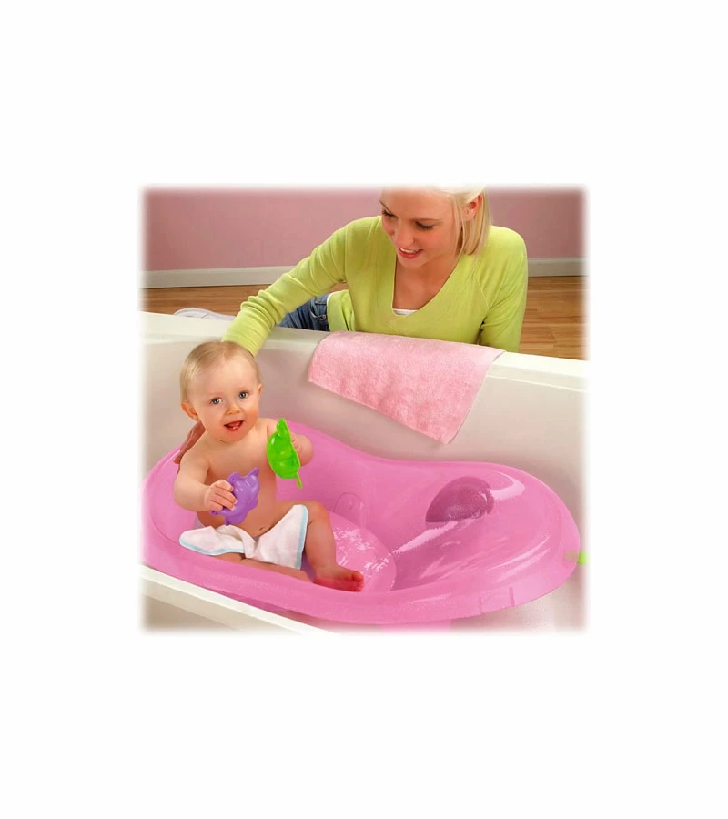 Make bath time more comfortable for you and baby with the pink sparkles tub that grows with baby girl from newborn to toddler. The unique sling supports and cradles your newborn comfortably and safely. As she grows, the sling can be adjusted to hang from the narrow end of the tub to provide reclining support. When she needs more room, she can sit at the wider end of the tub. Bathtime accessories and an infant head support included.