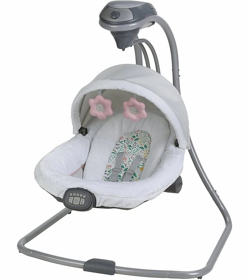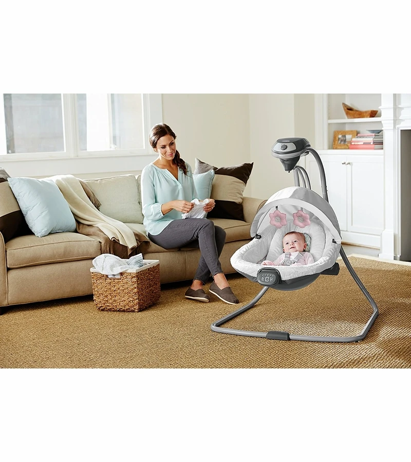 Nothing is better than Mom, but the Graco Soothe Surround technology mimics time-tested, proven methods that parents use to soothe their little ones within our Oasis Swing. Soothe Surround recreates these soothing techniques, like the middle of the night car ride, within the swing, by linking the sound and motion of a moving car to soothe baby from the comfort of your own home! Four additional environments mean you can find the right fit for your little one’s mood anytime. The extra plush fabrics, new seat shape, and extended canopy provide the optimal comfort space for baby!