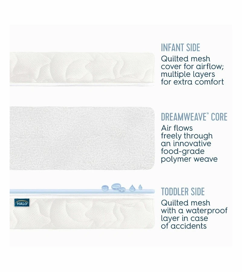 Our breathable baby mattress is significantly more breathable than a traditional crib mattress. The innovative design features our fully breathable DreamWeave™ core and a cover made from multiple layers of breathable quilted 3D mesh. Made with only baby-safe materials, this hypoallergenic crib mattress is also 100% washable to prevent germs. 100% recyclable, making it a great eco-friendly baby mattress choice.