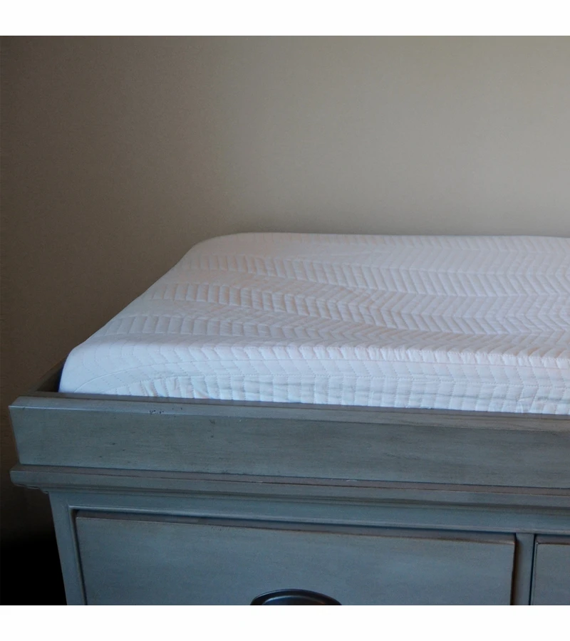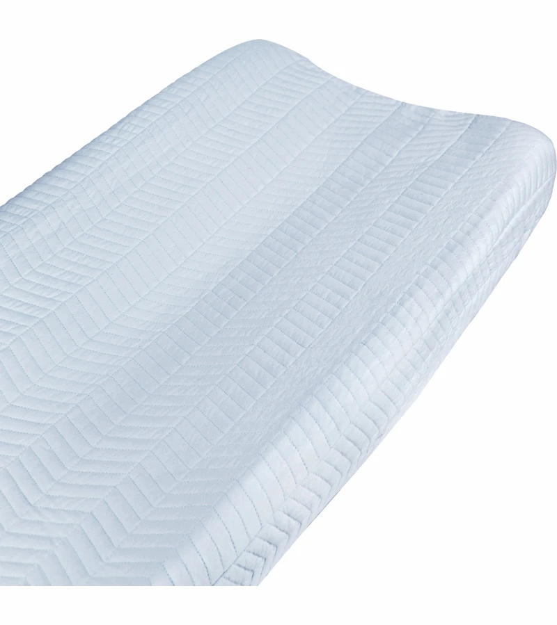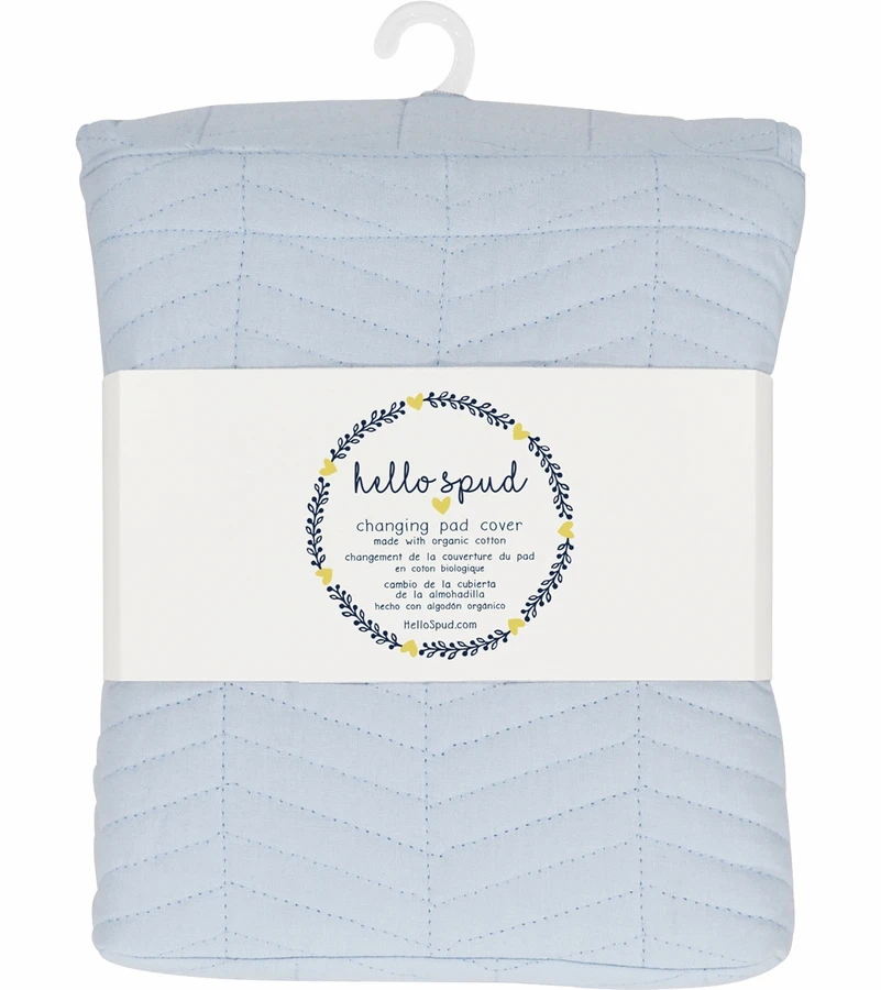 Hello Spud’s Blue Chevron Quilted changing pad cover is perfect for your little one’s nursery. 100% organic cotton, fits standard changing pad with straps. Fits changing pads up to 19? wide x 34? long x 6? deep.