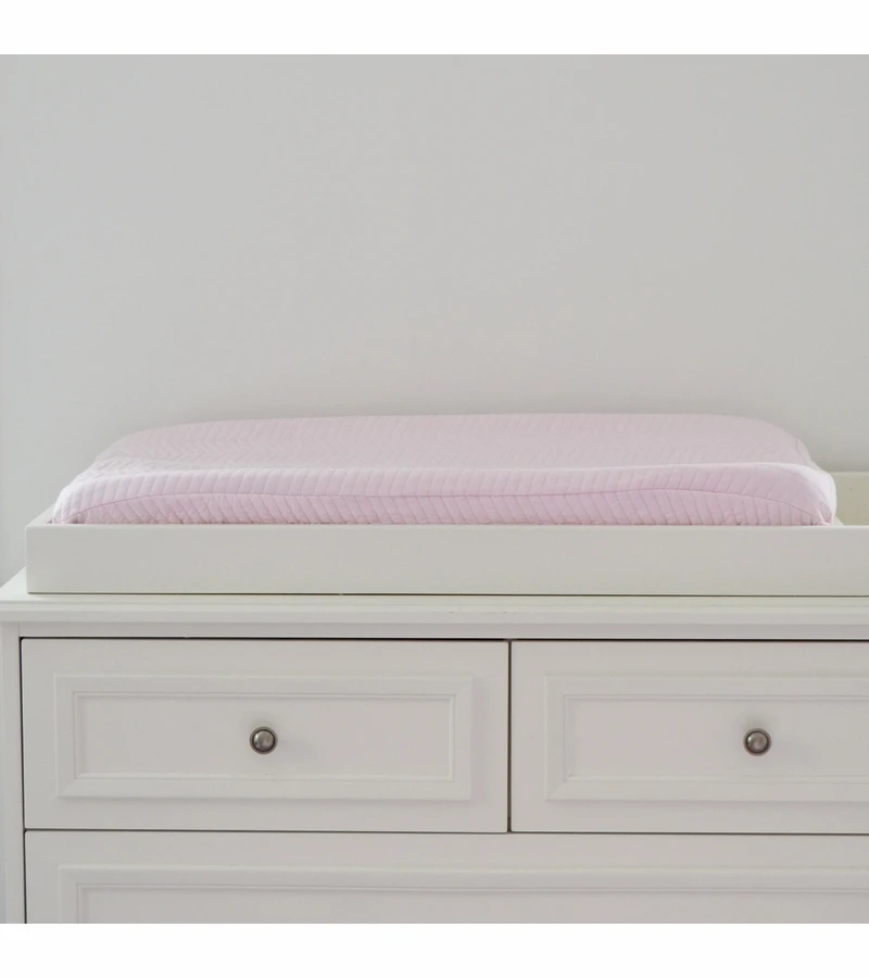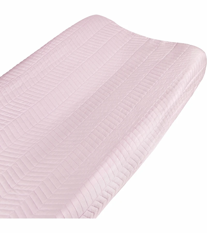 Hello Spud’s Pink Chevron Quilted changing pad cover is perfect for your little girl’s nursery. 100% organic cotton, fits standard changing pad with straps. Fits changing pads up to 19? wide x 34? long x 6? deep.