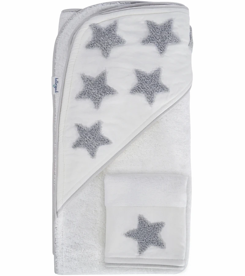 Hello Spud Organic Cotton Hooded Towel And Washcloth Set – Gray Stars