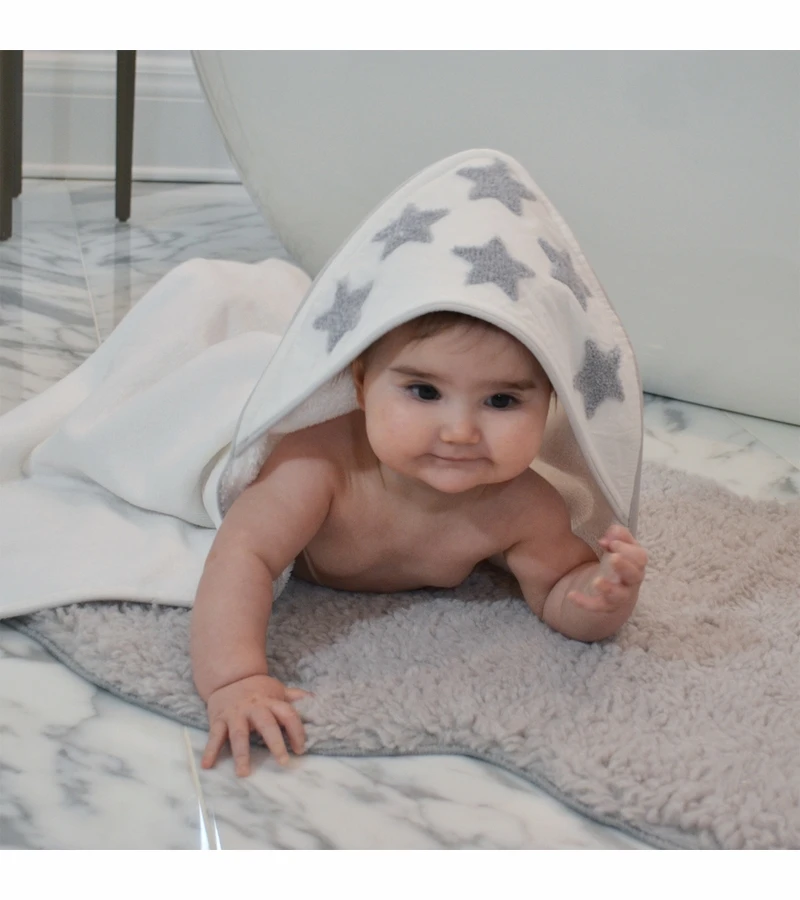 Hello Spud’s Gray Stars Hooded Towel Set is a lovely gift for any baby. Made with certified organic cotton. Each set includes one 30″ x 30″ hooded towel and one 10″ x 10″ washcloth. Hello Spud’s organic terry cotton is super soft! Hooded towel is oversized so you can keep using it as your baby grows into toddlerhood.