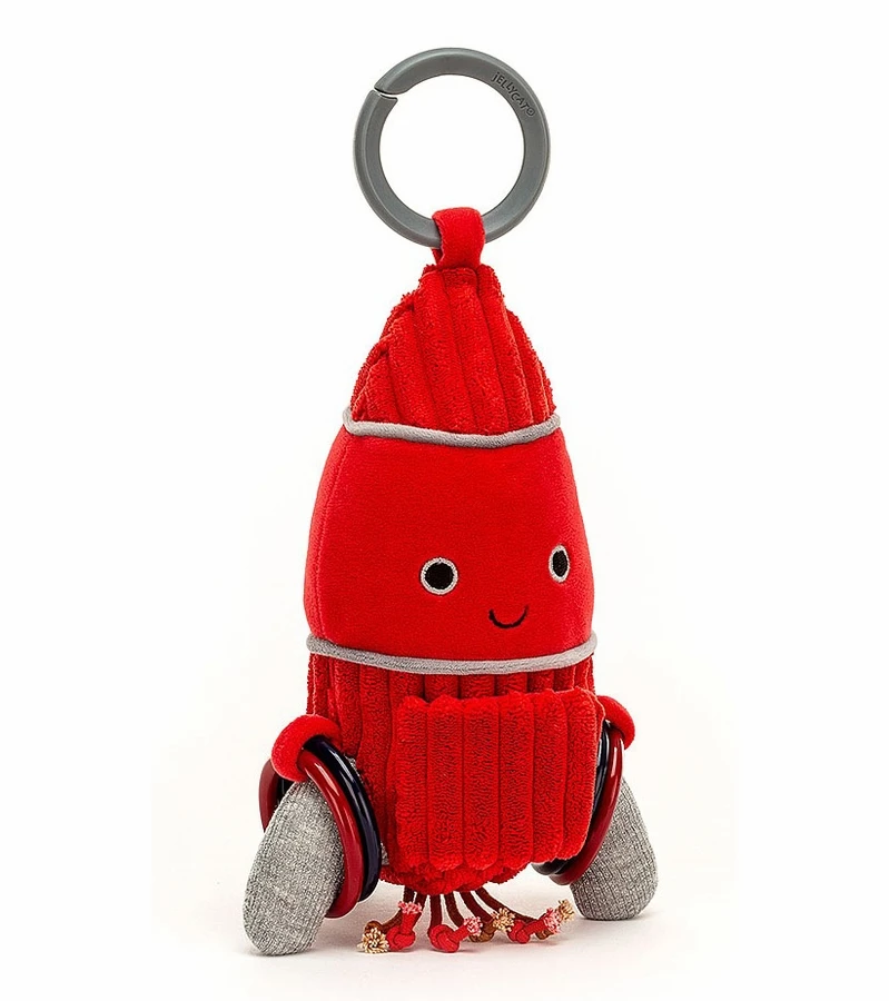The Cosmopop Rocket Activity Toy is cute and cordy in scarlet and silver with sparkly feet and a marvellous mirror! This smiley spaceship has a velcro tum, a squeaky tip and clackity rings, with knotted laces for colourful jets!