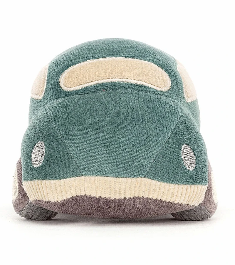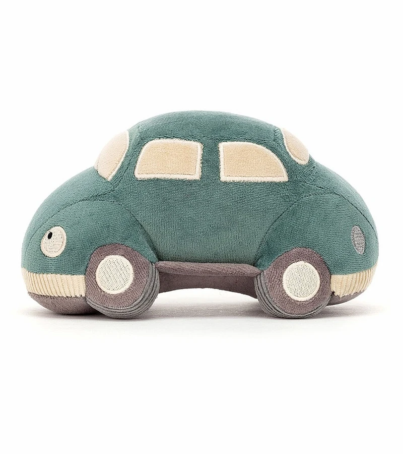 Wizzi Car is coming through, in a rush of cordy turquoise-blue! This busymobile has a cordy cream bumper, chunky grey tyres and stitchy windscreen wipers! If Wizzi Car bumps into something, you’ll hear a cheeky Toot toot! Vroom!
