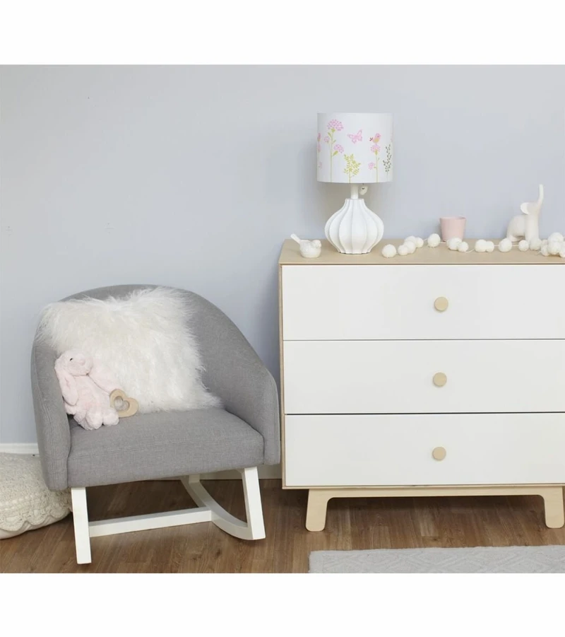 Provide warm light in the nursery with the Botanica Lamp. Featuring a simple outline of pink flowers, butterflies and birds, it’s the perfect accessory to complete the look of any nature themed nursery collection, especially the Just Born? Botanica Nursery Bedding Collection.