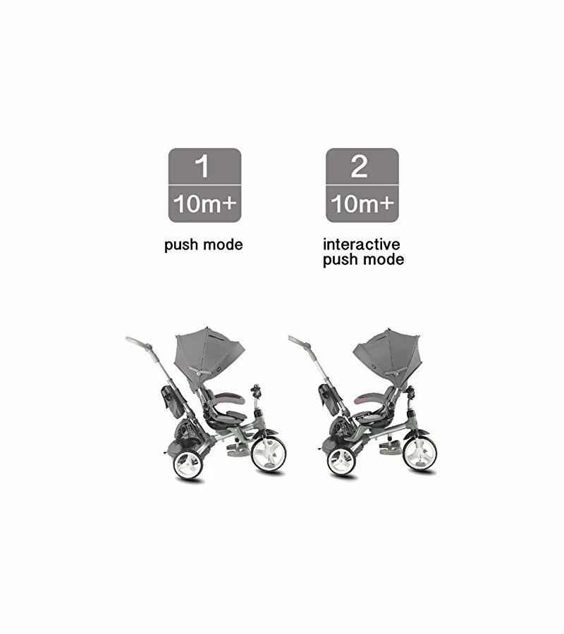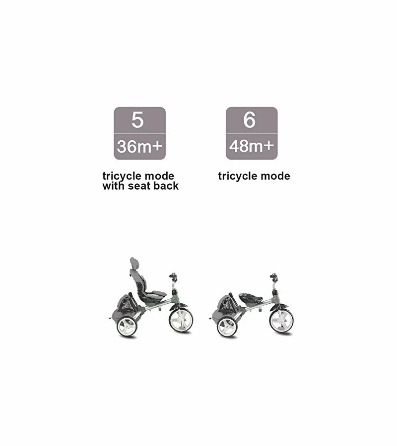 The world’s most advanced Trike-Tech. The 6-in-1 Multi-Trike adapts to your growing child with six different modes. The two position highback padded seat, three point safety seatbelt and UV-protectant canopy will help your little one stay comfortable. The unique seat feature allows you to have your child forward or rear facing. Includes a safety bar and two type of footrest, one for infant use and one for toddler use. Stroller style handle adjusts in height and angle. The handlebar makes maneuvering and steering from behind a breeze. Front wheel has on/off switch to go from coast mode to pedal mode.