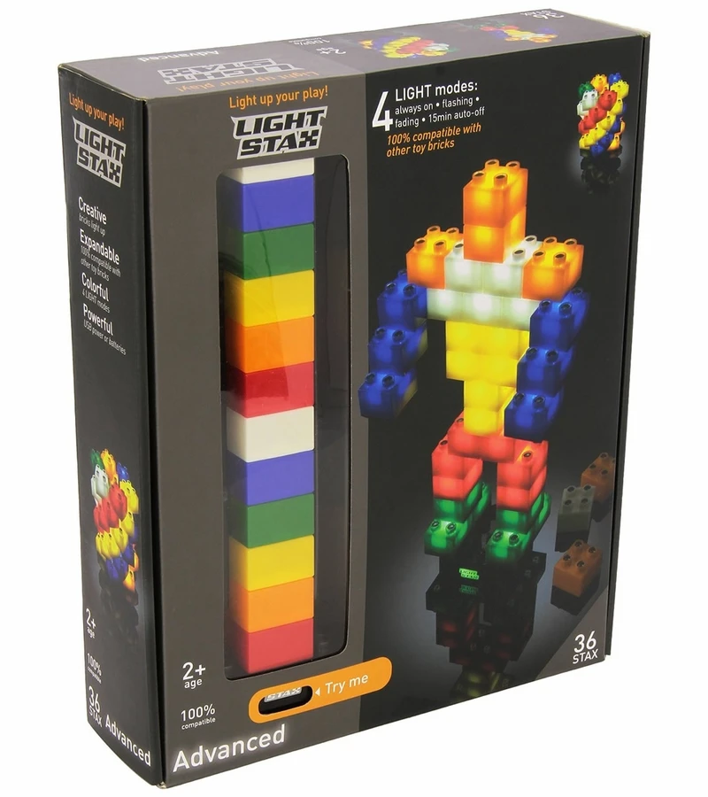 Building blocks that glow! These beautifully colored building blocks are different than the traditional building blocks because they are built from a powered base and every block lights up as you stack them. There are endless possibilities to fulfill imagination and creativity since there is not a wrong way to stack the blocks. Use Light Stax as a custom night light with 3 light modes: solid, flashing, and fading. All three modes have a 15 minute auto shut-off. This set offers you the opportunity to build a museum quality sculptural masterpiece. Set includes 36 Stax in 6 colors, 1 power base, and 1 USB power cable. 100% compatible with other building blocks of similar size. One power base via USB lights up hundreds of Light Stax blocks. Requires 3 AAA batteries (included).