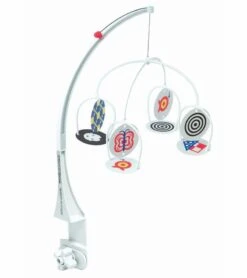 Introduces baby to high contrast images and colors for early visual and multi-sensory development. Ten interchangeable graphic cards offer a range of simple high-contrast images to more complex colored patterns and graphics to foster visual development. Graphic cards are labeled by age to guide you with recommended graphics to use as baby’s vision develops. Adjustable cord on the infant stim mobile allows you to easily change distance of graphics from baby as their vision develops. Our infant mobiles received a second place ranking among readers of Baby & Children’s Product News. This includes our Skwish® mobile and our Wimmer-Ferguson® Infant Stim-Mobile.