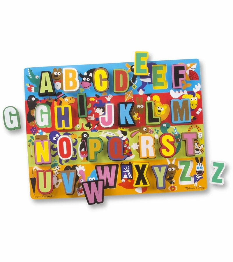 Alphabet fun begins with this extra thick wooden puzzle that includes 26 easy-grasp, chunky pieces (A-Z). Each piece is shown with a colorful picture that begins with that letter, and a full-color, matching letter is shown under each piece. Letter pieces stand up. Encourages hand-eye, fine motor, letter recognition and pre-reading skills.