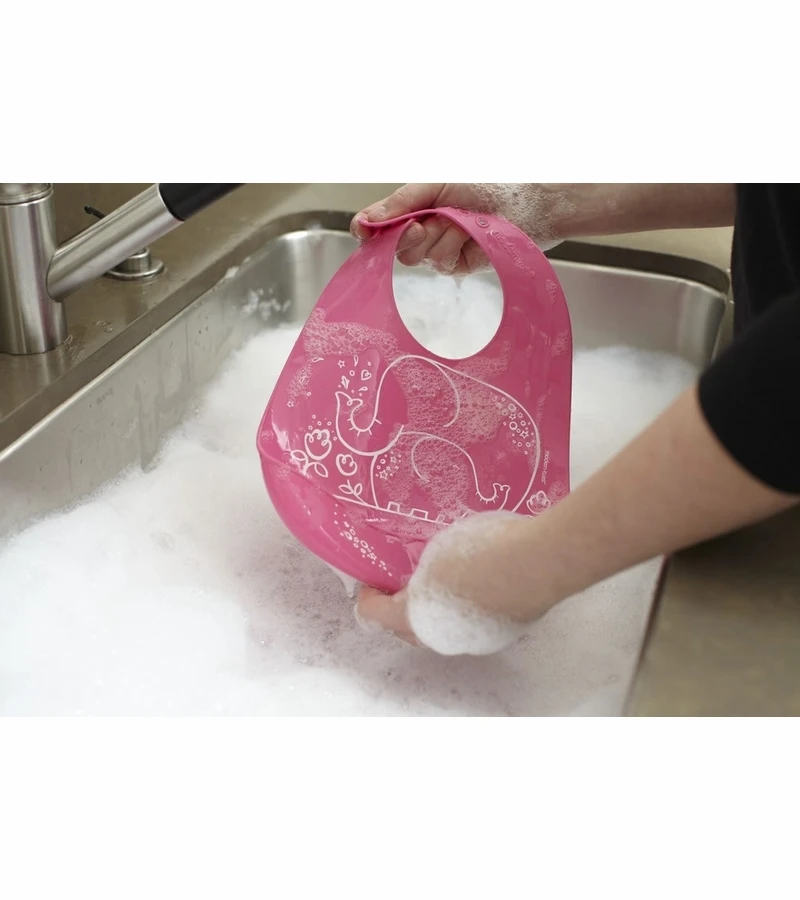 The plastic-free Bucket-bib is made of pure, silky soft reusable silicone that keeps your babyÂ’s sensitive skin happy and prevents single-use options from ending up in our oceans and landfills. Reuse over and over knowing that your baby is safe from lead, latex, phthalates, BPAs, and other harsh chemicals found in plastic and lower-grade silicone. Roll up the flexible, memory-free bib for on-the-go dining and rescue clothes from endless spills and stains with the non-porous and dishwasher safe material.
