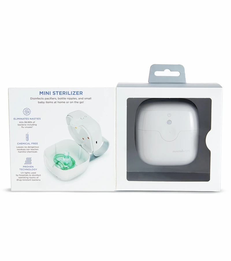 Babies drop things in dirty places at the worst times. The portable Mini Sterilizer sanitizes pacifiers, bottle nipples, and more in under a minute so you can be on your way anywhere. The Mini Sterilizer safely eliminates 99.9% of germs, bacteria, viruses* including (ATCC VR-740, Strain 229E) – a seasonal strain from the same family as -19 using just UV light and has been tested by independent labs. No chemicals, heat, or water needed! The Mini Sterilizer’s 4 gold-plated UV LED lights are mercury and ozone free and auto shuts-off when the lid is opened. This small device is easy to throw into (or attach to) a purse or diaper bag, so when you need it, it’s right at hand. Perfect for use in the home, but extra handy for public spaces such as daycare, playgrounds, doctor’s offices, airports, and more! UV light is a safe and proven method of killing bacteria that is used by hospitals to sanitize everything from operating rooms to surgical equipment. Munchkin has partnered with 59S, the leader in UV LED technology, to develop convenient, UV-based sterilizing solutions that help families with young children lead healthier lives.