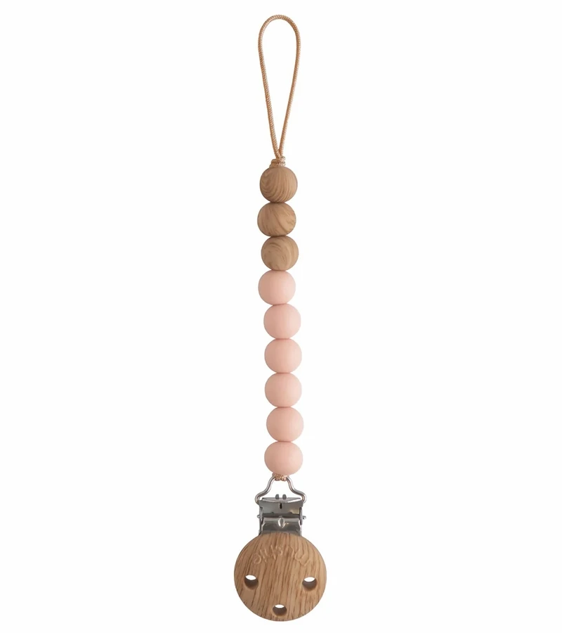 The Mushie silicone pacifier clip offers durability, function and simplicity to families on-the-go. Made from 100% food-grade silicone, our clip features a faux wood silicone clasp that brings a modern take to a traditional favorite. With a simple stack of silicone beads in two complementary colors, the Eva clip offers a sophisticated touch to your pacifier accessories. The clip is easy to clean and helps keep soothing items in reach for little ones.