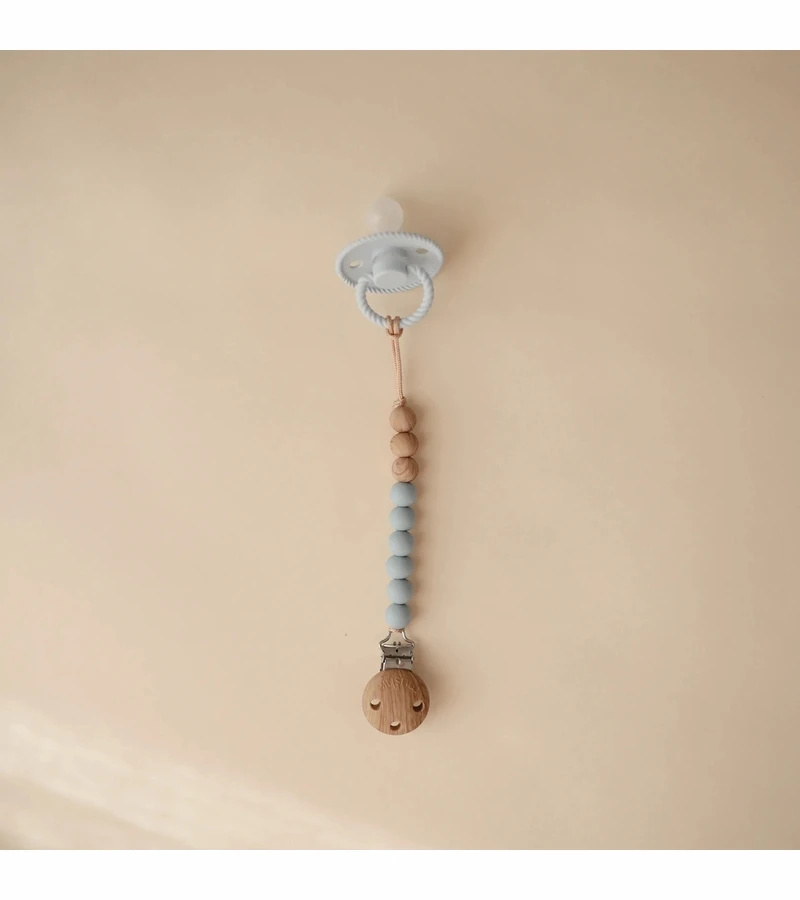 The Mushie silicone pacifier clip offers durability, function and simplicity to families on-the-go. Made from 100% food-grade silicone, our clip features a faux wood silicone clasp that brings a modern take to a traditional favorite. With a simple stack of silicone beads in two complementary colors, the Eva clip offers a sophisticated touch to your pacifier accessories. The clip is easy to clean and helps keep soothing items in reach for little ones.