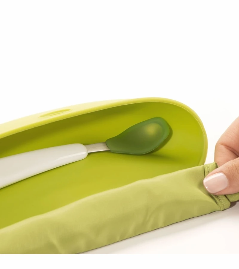 - Spoon rolls up inside Bib, and Bib secures closed for easy transport