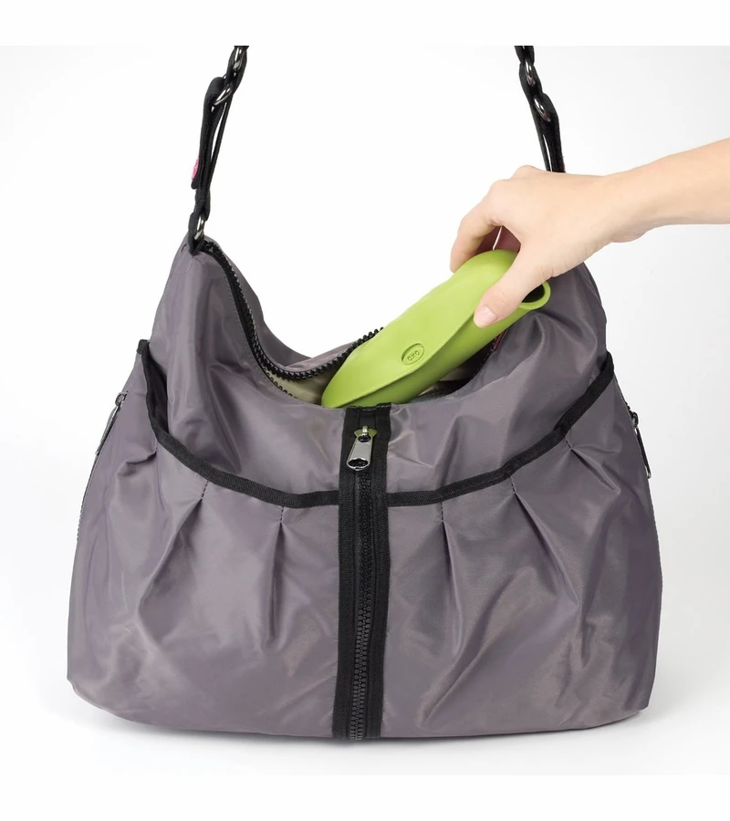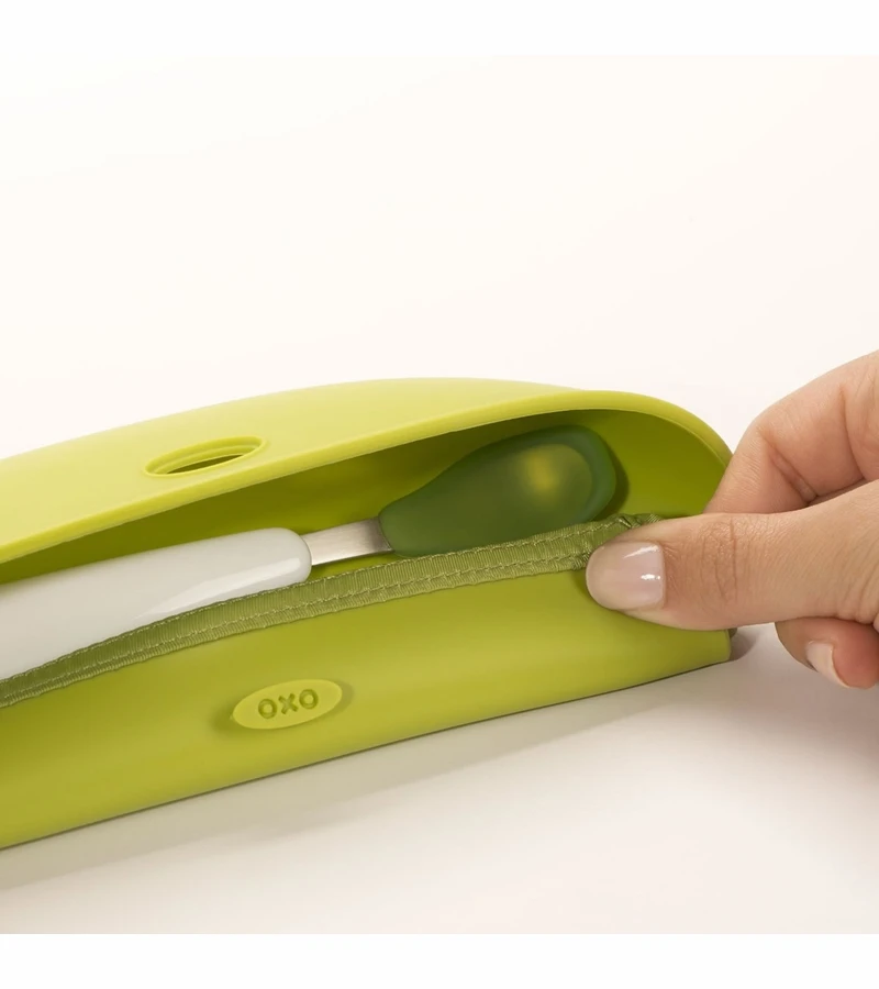 Whether feeding baby at home or on the go, keep it clean with the OXO Tot Roll Up Bib and Spoon Set. The BibÂ’s soft, food-safe pocket is wide enough to catch virtually any stray pieces of food that miss babyÂ’s mouth. The fabric portion of the Bib provides ample coverage to protect babyÂ’s clothes, and is shaped for comfort during mealtime. Easy-to-use Velcro closure is secure enough to resist totÂ’s tugging (really!) and is adjustable as your little one grows. Both the fabric and silicone materials are easy to wipe clean. Feeding Spoon has a protective food-grade silicone coating which is gentle on babyÂ’s gums and mouth. The soft edges of the silicone can be used to scrape the last bit of sweet potato from the bowl or jar, or to gently wipe applesauce from babyÂ’s face. The shallow Spoon prevents feeding baby too much food at once. A contoured handle is comfortable to hold and angled for easy feeding. When youÂ’re out and about, simply roll the Silicone Spoon up in the BibÂ’s fabric and into the silicone pocket, secure closed and tuck into a diaper bag. BPA, PVC, and phthalate free.