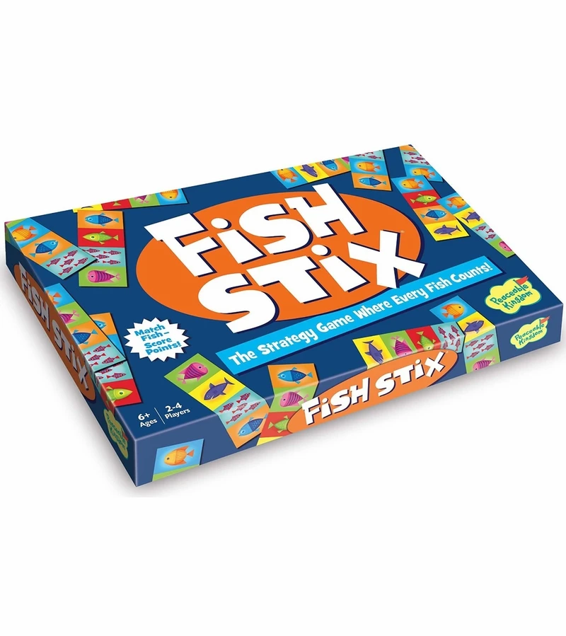 Match fish, score points. Each player has a scoreboard, six fish tokens and three fish sticks. Take turns matching fish sticks and counting fish. The board grows as the game goes. You can play with or without strategy making it easier for different ages to play together. Ages 6+ years.
