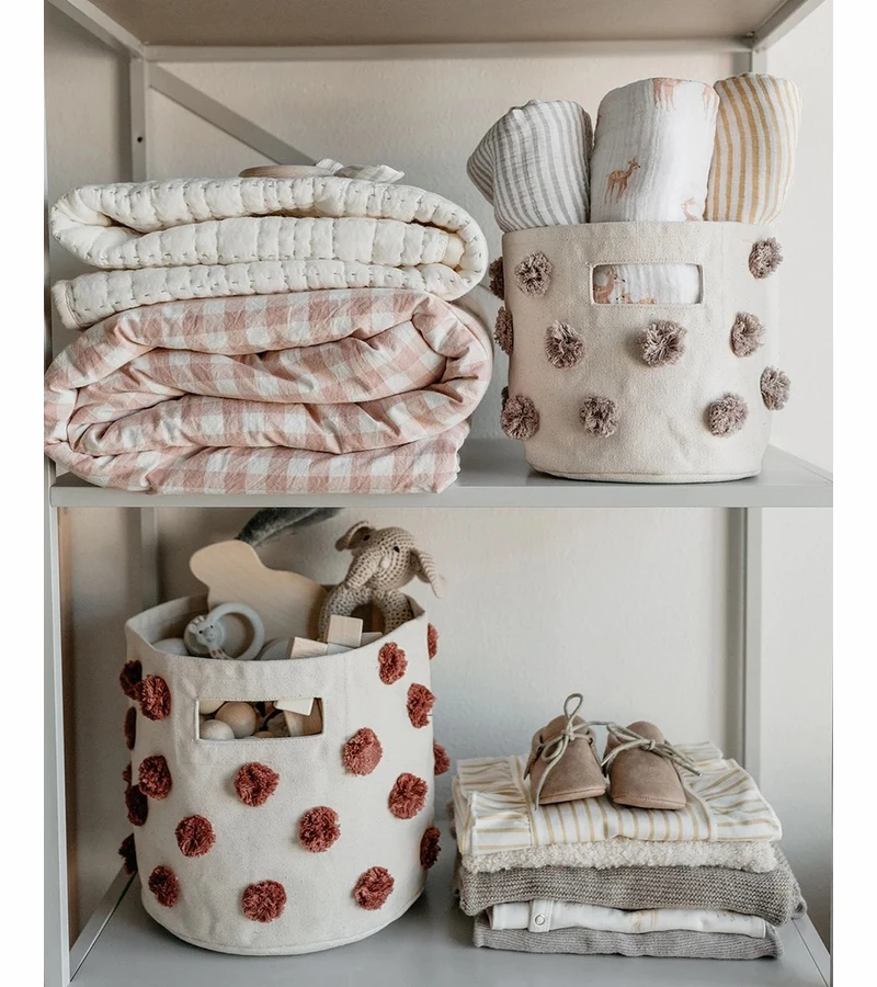Declutter and update your decor with this durable cotton-canvas storage Pint that is perfect for diapers, creams and other small stuff! With each Pom Pom sewn by hand, it will add a pop of playfulness to any room.