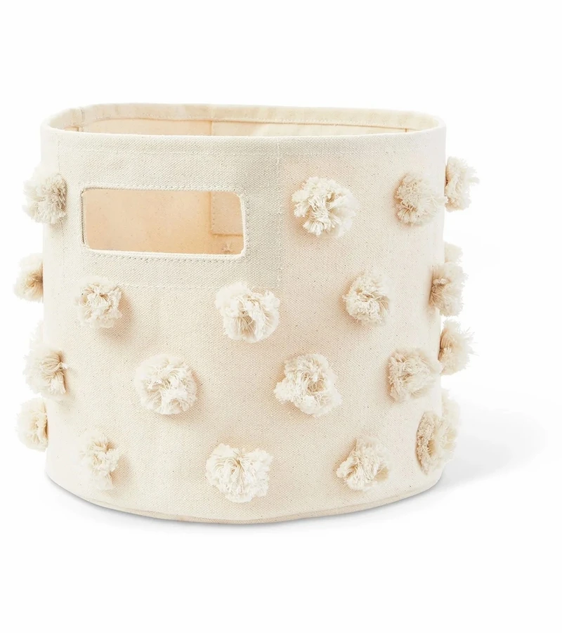 Declutter and update your decor with this durable cotton-canvas storage Pint that is perfect for diapers, creams and other small stuff! With each Pom Pom sewn by hand, it will add a pop of playfulness to any room.
