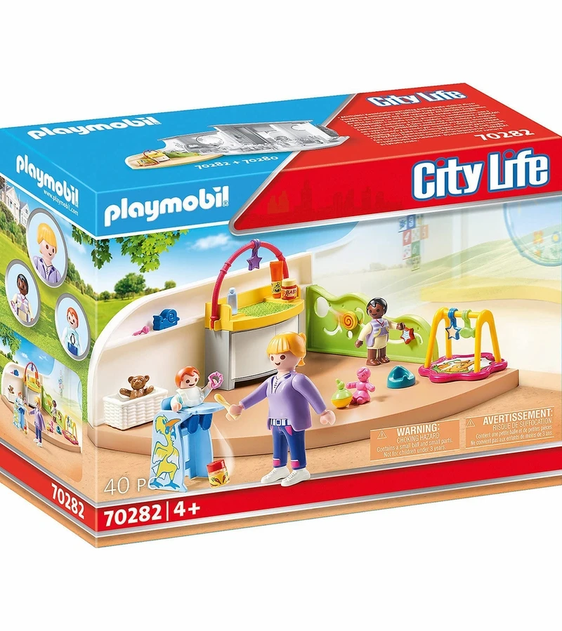Figures:1 woman, 2 babies Accessories: 1 base plate crawling group with back wall and motoric wall, 1 changing table, 1 high chair, 1 baby activity centre, 1 basket, 1 potty, 1 teddy bear, 1 doll, 1 pacifier, 1 rattle, 1 water bottle, 1 tube, 2 cans, 1 spoon, 1 bib, 1 play snail, 1 standing figure