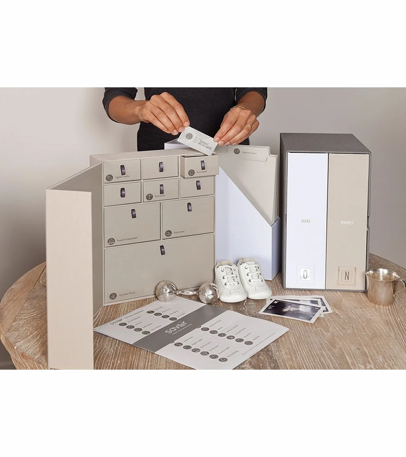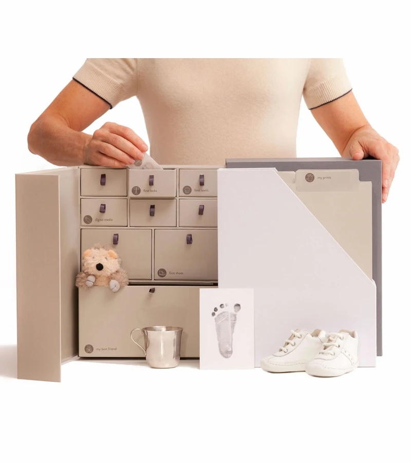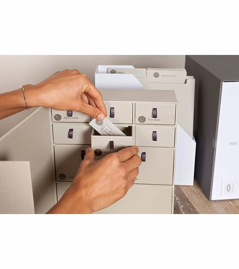 A bespoke and super easy system to organize, enjoy, and store your most important childhood memories. We’ve thought of every detail to make sorting all your keepsakes – from the blankie that comforted her to the first lost tooth – a snap. Acid-free drawers, vertical files for documents, even mini envelopes for that first lock of hair or first tooth, and illustrated labels help you organize and then find these cherished items.