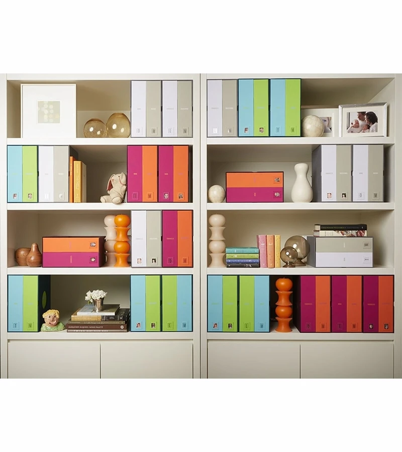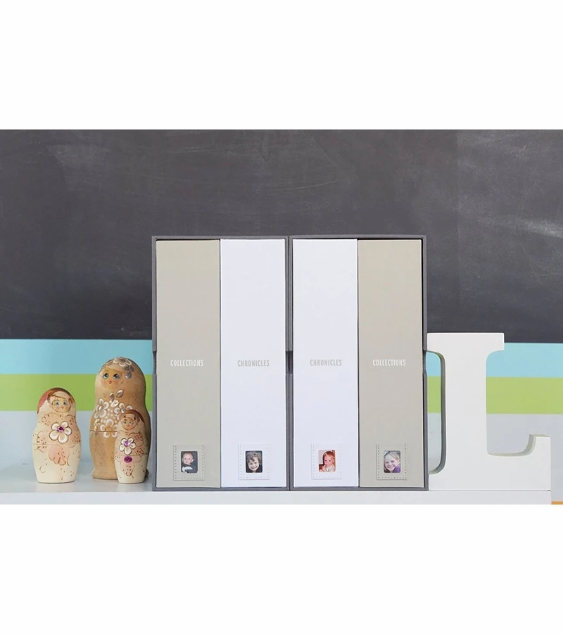 The sturdy, custom-dyed fabric boxes of The Library are meant to be displayed like beautiful books and passed on proudly to the next generation, more fitting than that old shoe box. While childhood may be fleeting, the memories last forever with The Library Starter Set.