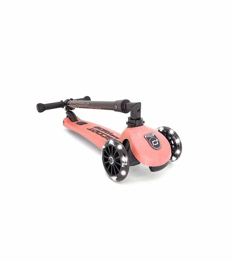 Scoot & Ride HighwayKick 3 standing scooter will quickly become your child’s favorite thing to ride. It ensures maximum stability by means of two front wheels and our safety pad as rollover protection. Our scooter has an adjustable and foldable handlebar for improved handling it also allows easy storage. The handlebar can be raised anywhere between 24-32 inches. No tools required for adjusting handlebar height or for folding it down, making it easy for anyone to adjust. All three wheels features white LED wheels to make your ride the coolest and flashiest on the street.