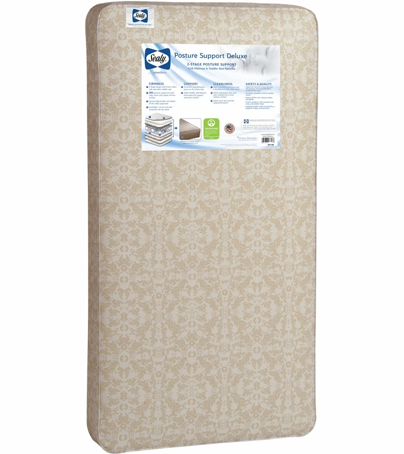 The Sealy Posture Support Deluxe 2-Stage Crib Mattress offers your newborn the firmness of premium 204 innerspring coil system. More coils create a firmer overall surface for your baby. Plus weÂ’ve enhanced this model with secure steel edges and 6 EverEdge guards to help protect baby near the corner and sides. This is perfect for when children sit near the edge of the bed.
