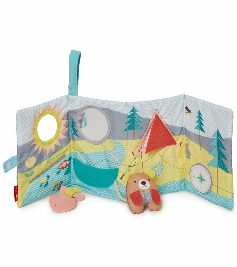 Soft baby books give little ones a whole world to explore! Simply unfold the pages for an interactive story. An adorable bear pops out to travel along the way. Crinkle pages, baby-safe mirror, squeaker and fun texture flaps engage baby.