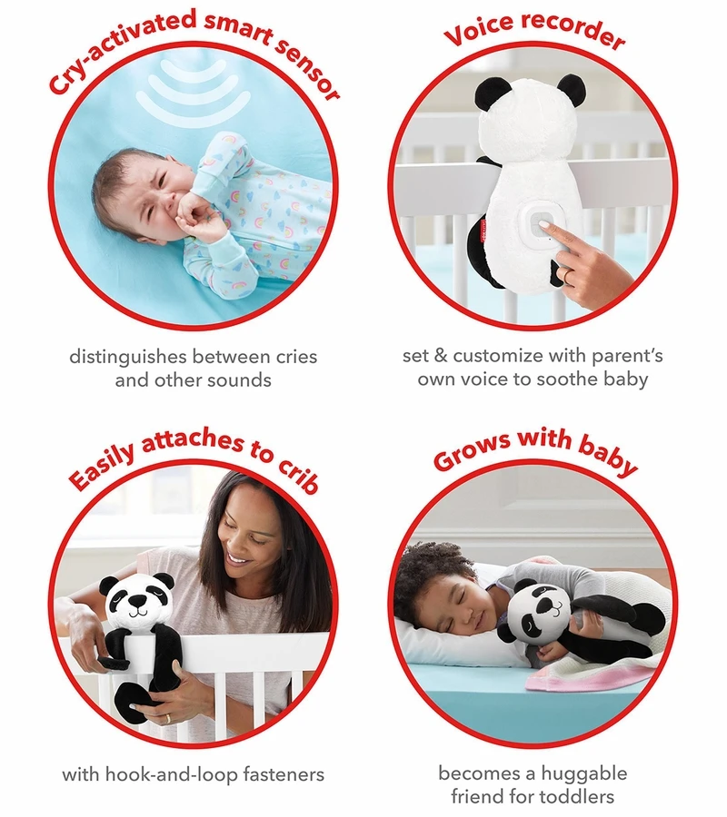Soothe baby with sweet songs, nature sounds and your recorded voice—even in the middle of the night! This soft bedtime friend features an innovative cry-activated smart sensor that automatically responds to cries so baby and parents get a good night’s sleep. Easy to attach to the crib, it’s also a cinch to set and customize—a voice recording option lets mom and dad comfort baby no matter where they are. As baby grows, it becomes a huggable friend for toddlers.