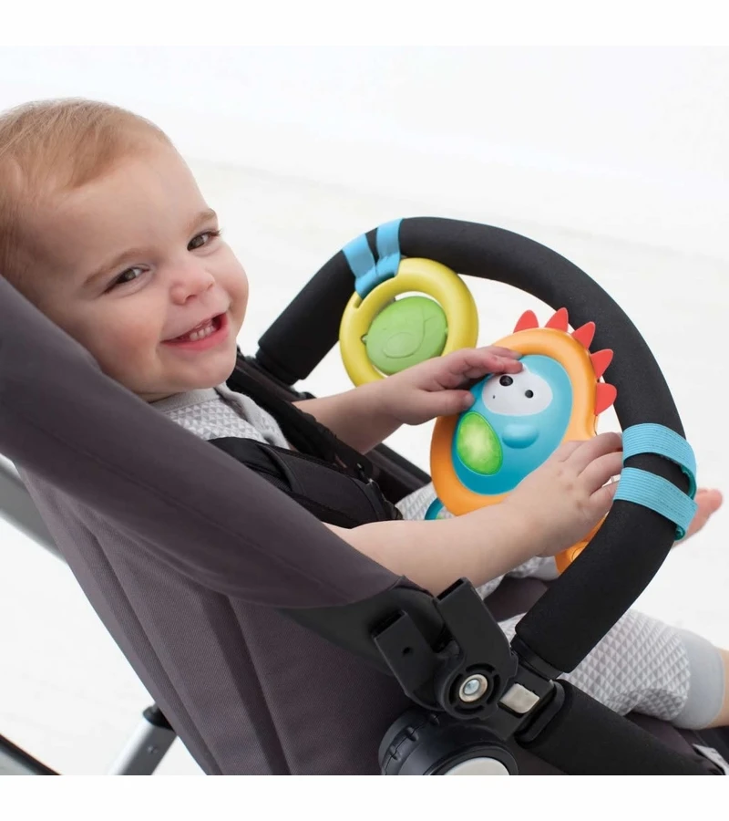 We’ve created one of the most entertaining stroller toys around—bar none! Our car seat toy bar is easy to attach to infant carriers and most stroller bumper bars for multisensory play on the go. With tactile spikes that are useful for teething, the light-up hedgehog plays four different songs and a fun sound when his belly is pressed. There’s also a spinning mirror and rattle ball, movable click-clack links, and even a place to add baby’s favorite toy. Baby will get “carried away” with fun!