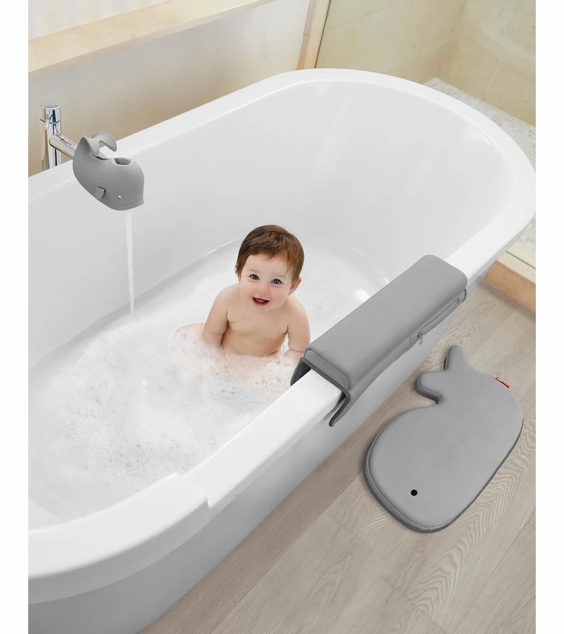 Bathing baby is a breeze with the help of our handy bathtime helper kit. Packed with four of our popular Moby bath basics in decor-friendly grey, the four-piece set includes a rinser, soft spout cover, padded elbow rest and kneeler. Now parents can be just as comfy as little ones during tub time. Makes a welcome gift for first-time parents, too!