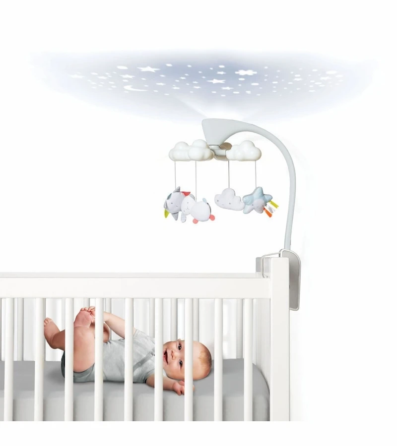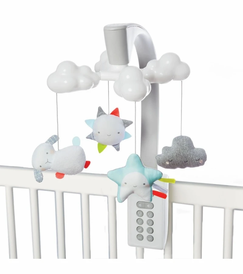 Our baby mobile has a soft color palette and sleek look to coordinate with the modern nursery. While stars are projected on the ceiling, it lulls little one to sleep with gently blinking leaves along with eight total lullabies and nature sounds. Just use the light and sound combination that’s right for your baby. A remote control allows you to restart the mobile after 20 minutes with the touch of a button, even from outside the nursery. Music to our ears!