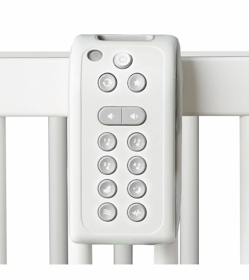 - Plays four melodies (Eine kleine Nachtmusik, Twinkle Twinkle Little Star, Brahms’ Lullaby, Rock-a-bye Baby) and four nature sounds (Rainforest, Jungle crickets, Waves, White noise with heartbeat)