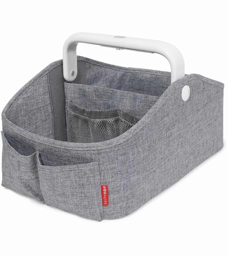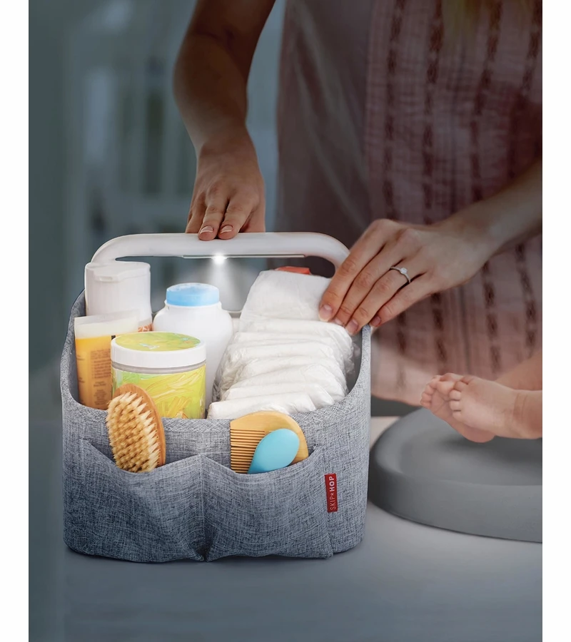 Shed some light on middle-of-the-night diaper changes with our modern diaper caddy! The handle shines softly with a touch sensitive light and a 10 minute auto-off feature. Organize diapers, wipes and more with a modular divider and four pockets.