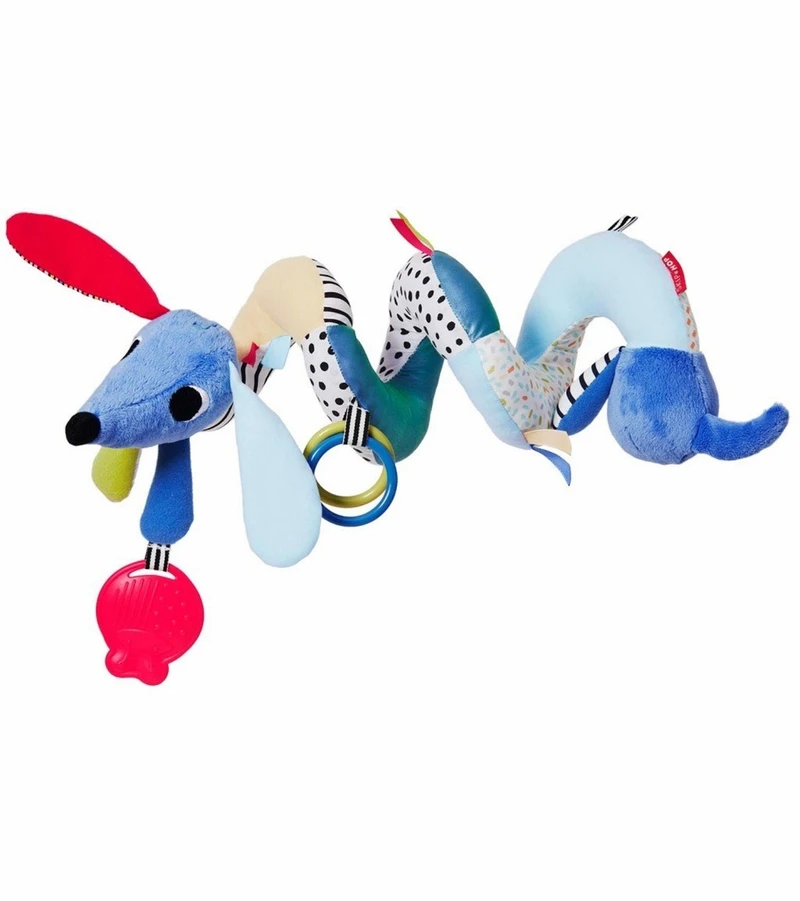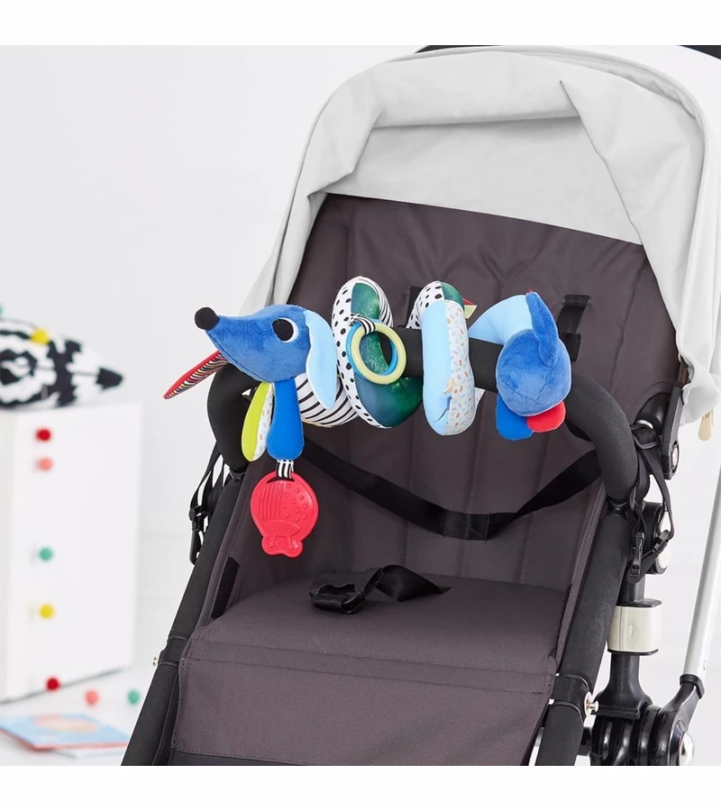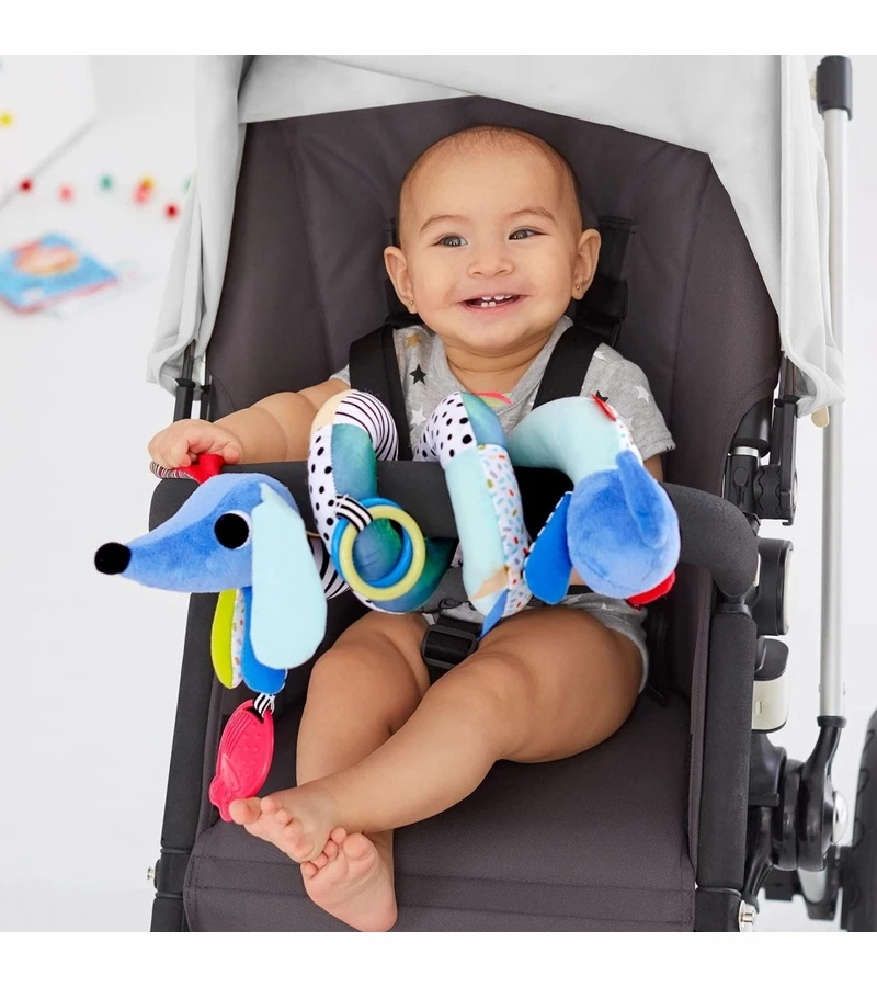 Let?s twist and shout! Our musical toy for baby offers on-the-go entertainment by easily twisting around stroller bars and carriers. Featuring high-contrast black and white patterns with bright, bold colors for visual development, our musical dog barks and plays two songs. Sensory features include crinkle ears, tactile ribbons, iridescent fabric, rattle rings and more!