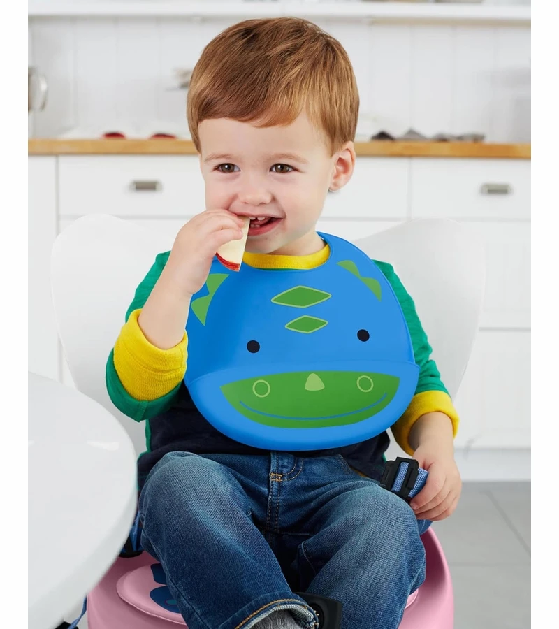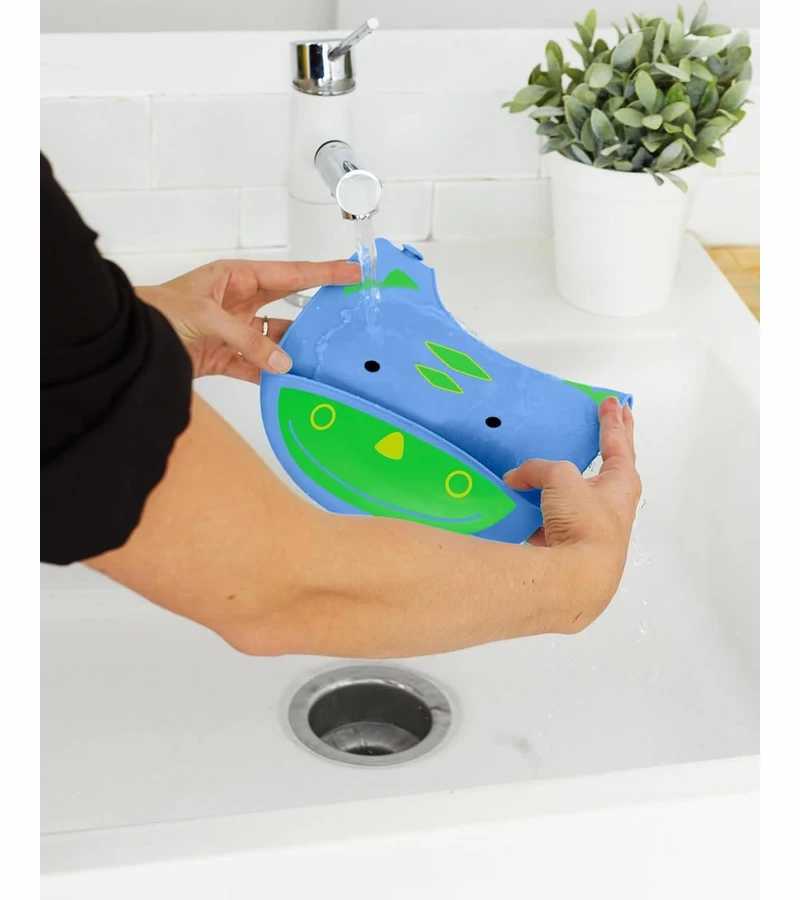 Most baby and toddler bibs get quickly stained and contribute to your laundry pile. Zoo Fold & Go Silicone Bib easily wipes down for quick cleanup. You can even pop it in the dishwasher! With a deep pocket to catch crumbs, it?s made of food-safe silicone and has an adjustable neck strap for baby?s comfort. Ages 6m+