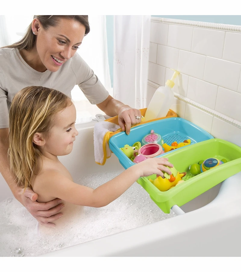 Stay Tidy Bath Organizer is an easy solution for organizing bath toys and essentials. Three colorful storage bins lock onto a sturdy pressure mounted rod on the back of the tub to keep all bath items within reach. Individual bins can be used separately for extended use.