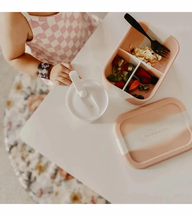 Ditch the plastic and switch to silicone! Our Silicone Bento Boxes are one of a kind and are perfect for your child’s lunch. They fit perfectly into their lunch box and you can place them in the freezer overnight to keep your child’s food cold for a period of time. The Bento Boxes have 3 available sections and a lid. The biggest section can fit a whole sandwich (Cut in Half).Â