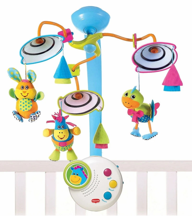 With multidimensional movement and tranquil music, the Tiny Love Classic Developmental Mobile entertains your baby and encourages important developmental skills. The mobile features a cylinder with colorful animals and black and white spirals. A music box offers continuous sounds for a soothing experience that engages the imagination.