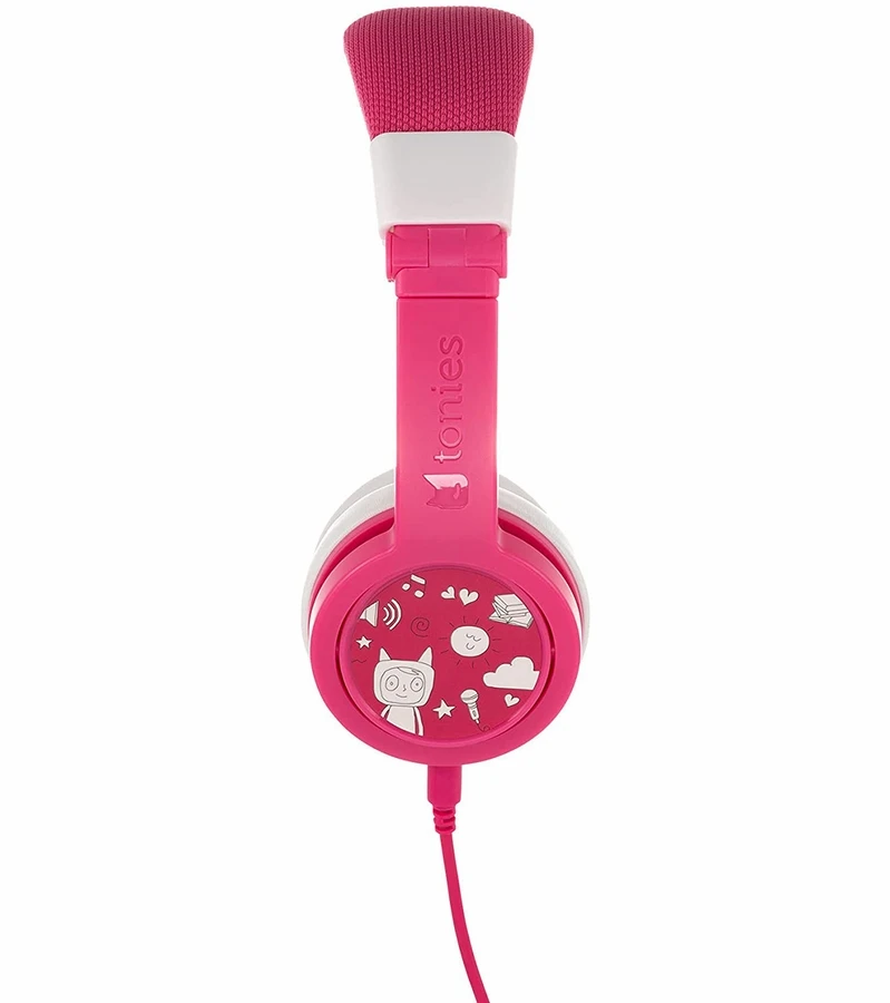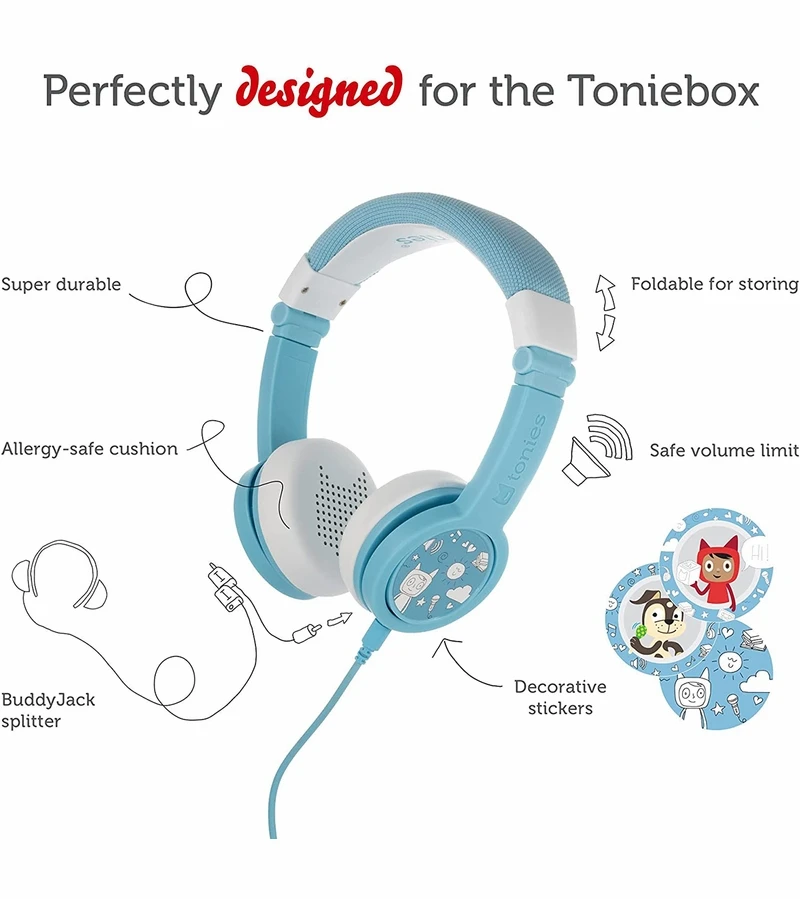Meet the Tonies Headphones! These foldable, durable, kid-safe, volume-limiting headphones come in six colors to match your Toniebox. Each headphone set includes a matching sticker set and a detachable audio cable with a BuddyJack splitter for sharing storytime with up to four sets of headphones from a single Toniebox.